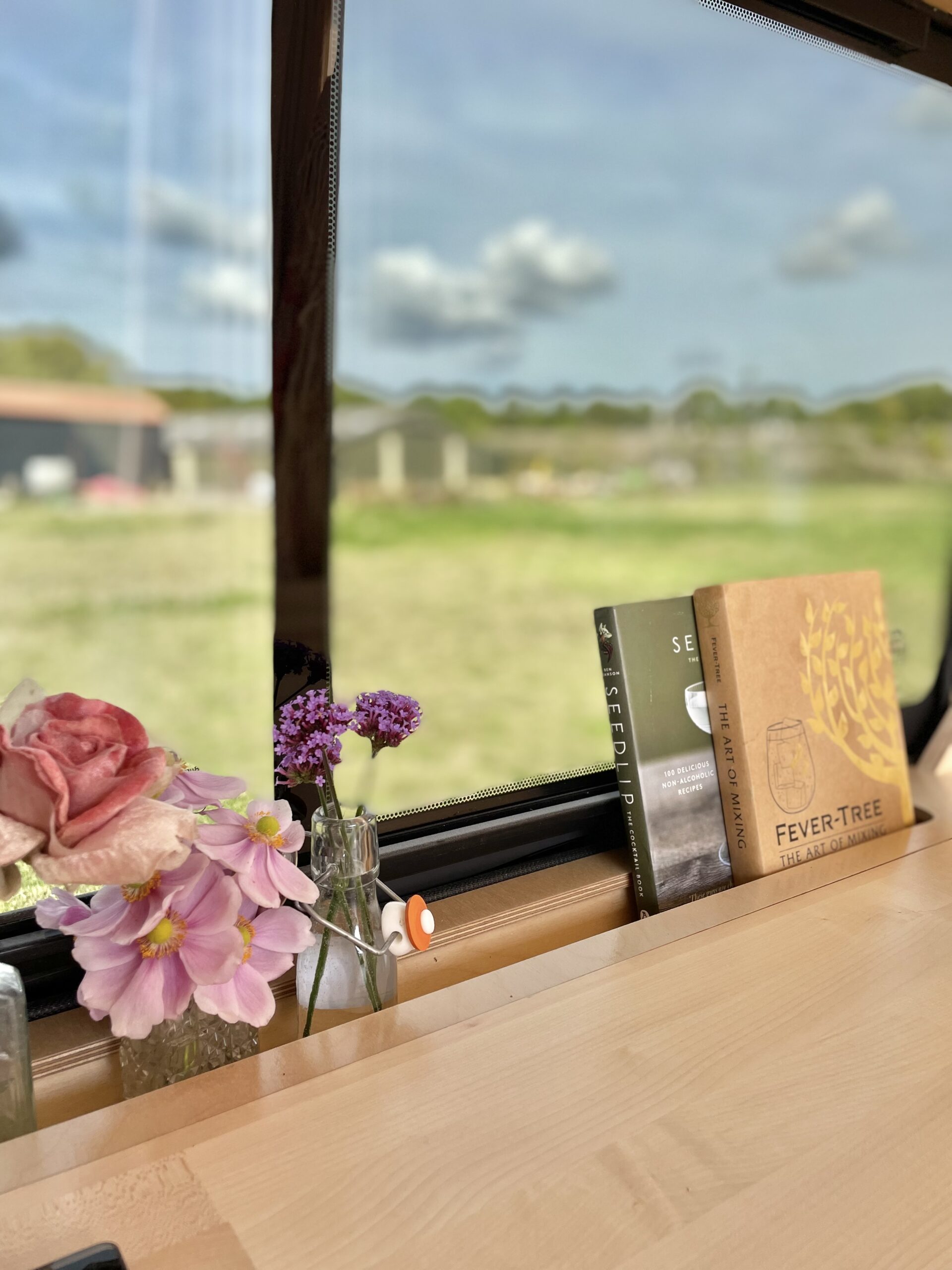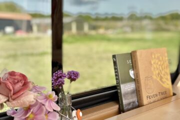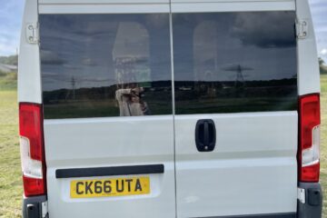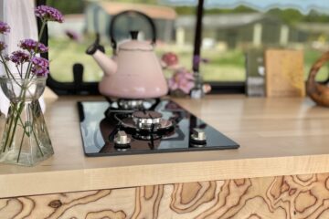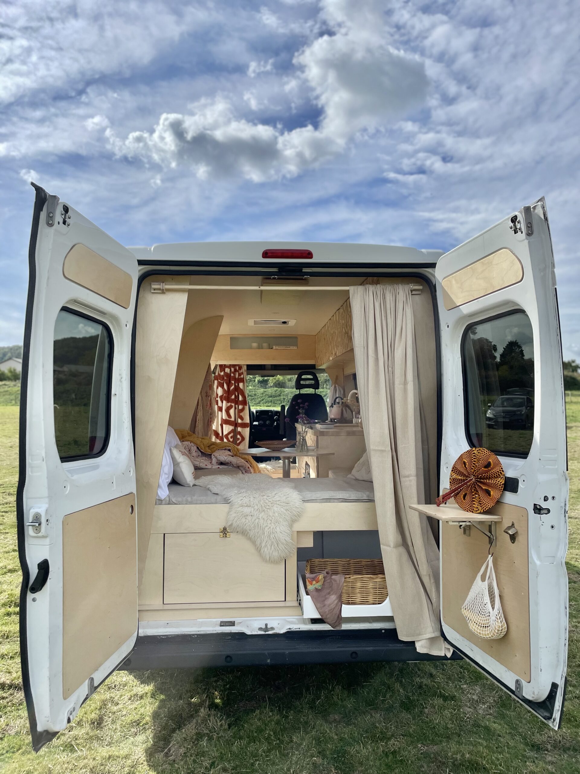 At the back of, Gene, there is a huge pull out storage drawer to the left whilst to the right is an open storage space also with a pullout to make storage access that little bit easier. We have opted for a lower seating and bedding area as we didn’t feel the extra few centimetres of ‘garage’ space warranted losing the wonderful open space within, Gene. On a back door there is a small fold up birch ply table for when you’re standing outside and enjoying the view or when snuggly inside in bed with the doors closed. With the sweet addition of a bottle opener you’ll never have to rifle around the kitchen drawer for one again!