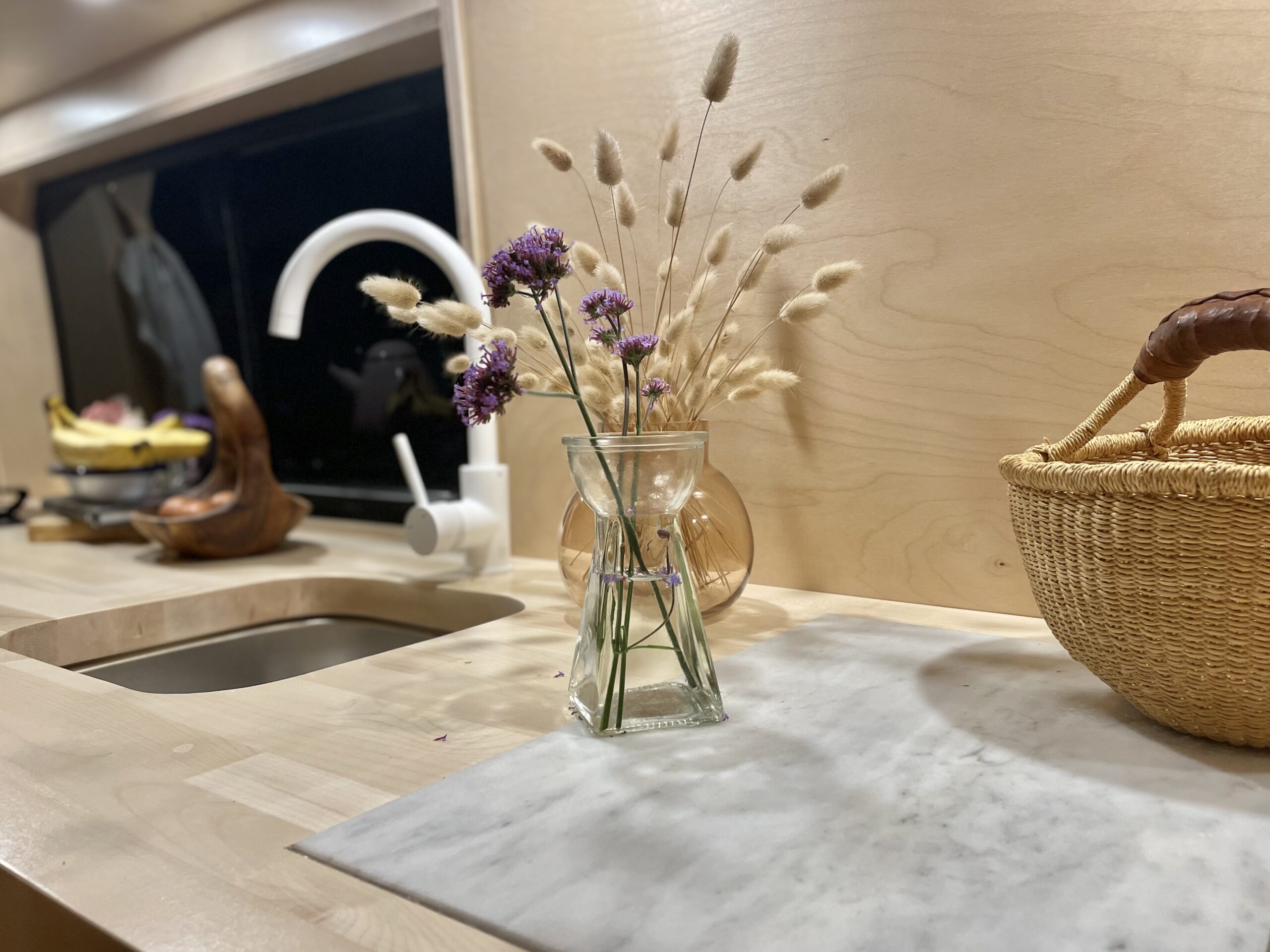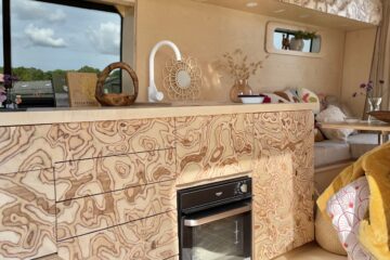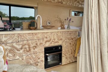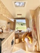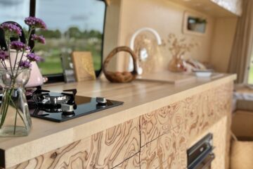 Next door again is a cork bin underneath the sink and extra storage. When we travelled in, Betty, it was always a bit of thing that we never had a dedicated space for a bin. On the end you’ll find the 85L Webasto 12v fridge. All concealed behind beautiful, minimalist carpentry. Sitting on top is a sleek and beautifully light coloured maple hardwood worktop with two hobs, a sink and a little thing we had up our sleeves, a marble inlay to put all things hot on, and it doubles as a chopping board! All drawers and doors in the kitchen area are soft close and the bench seat is on gas struts to make life a little easier when opening and closing. A Maxx Air Vent above this area makes for fresh air!