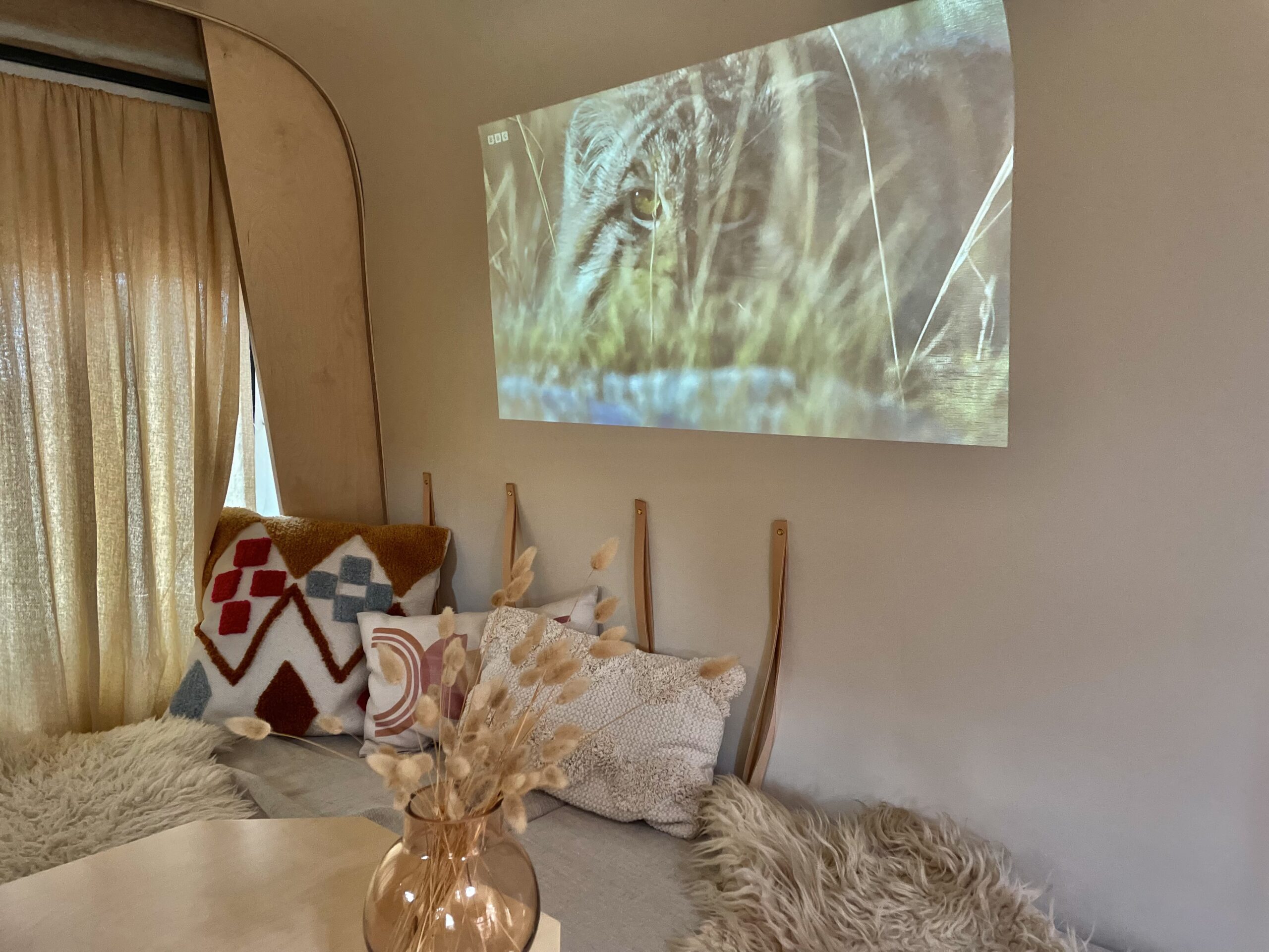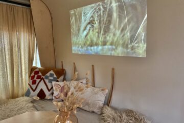 The spacious seating area is the perfect place to host parties up to six people or to simply lounge during the day for two. A teeny peek window brings light and airflow here and somewhere to pop some greenery and trinkets. The table drops down easily and the seating twists to create a comfortable double bed for the evening. Underneath there are two big boxes that we think would be perfect to pop in all things clothes and a dedicated box just for bedding which rolls up perfectly inside. Gene comes with a double duvet, two pillows and beautiful linen bedding. Natural leather straps keep the pillows close to the wall, great for storage but even better for daytime lounging. We’ve kept one wall completely white and free of storage so that it can be used for the projector which comes along with the van too.