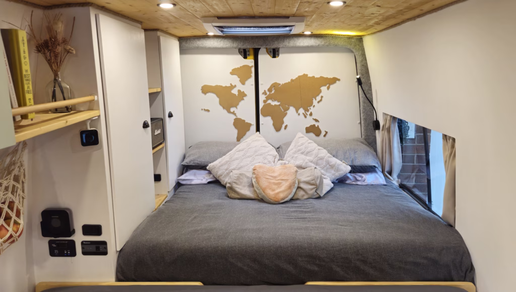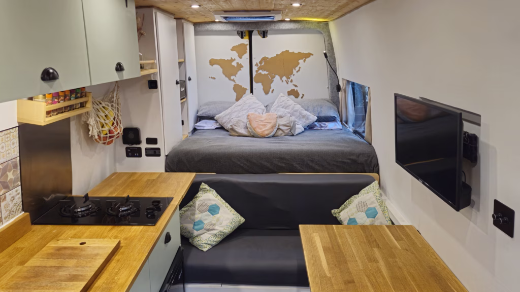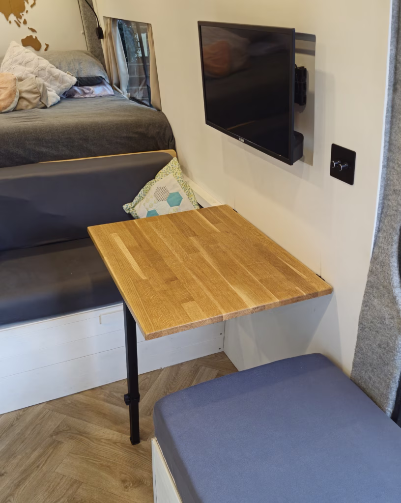 Full sized semi-fixed memory foam double bed (slides out over bench seat) – 135cm wide by 190cm long (4’6″ x 6’3″)