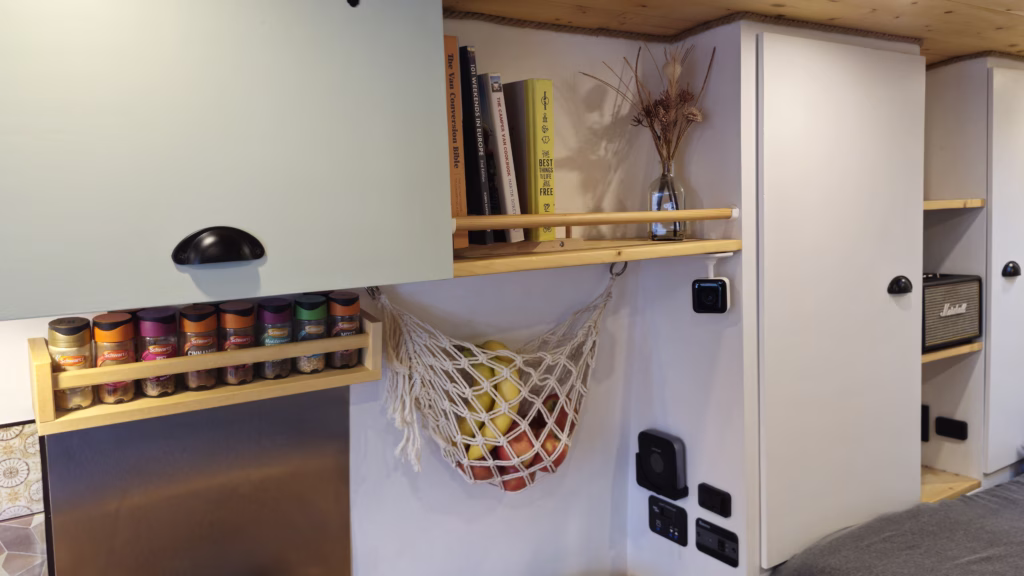 ● 3 shelves next to the bed with 240V socket and 12V USB socket ideal for charging cellphones and placing a mug of coffee.