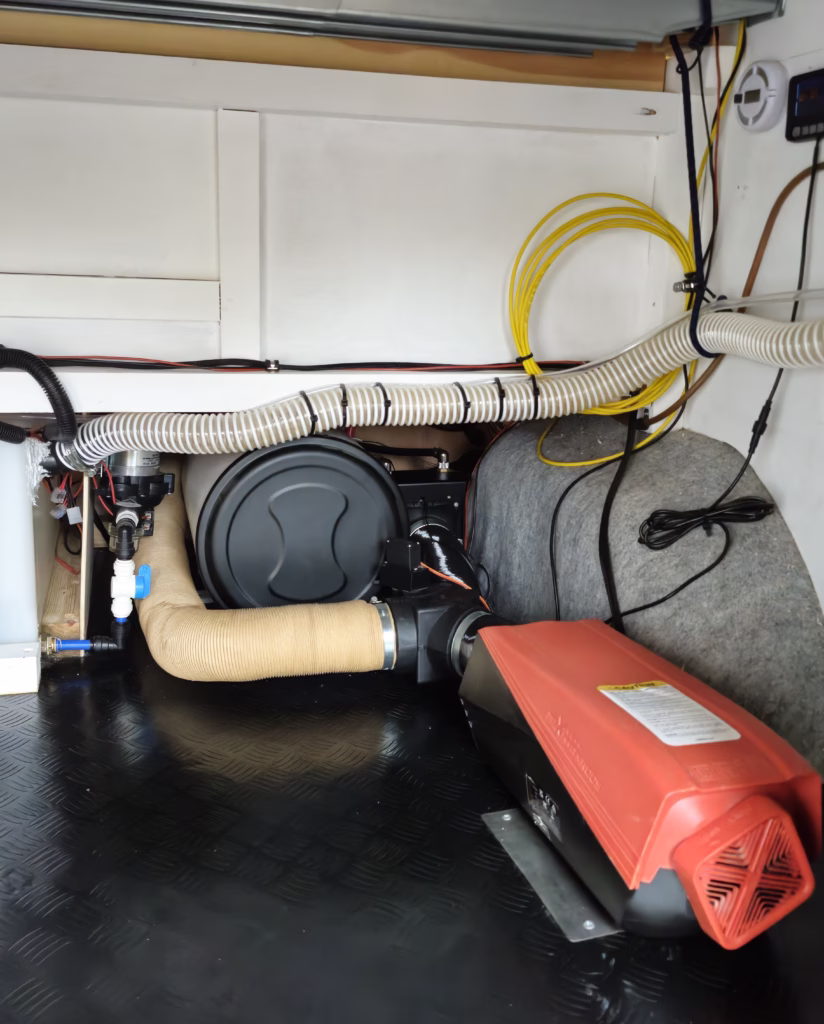 ● 12L Bobil vans air hybrid water heater & calorifier (12V and diesel heater heating elements) all controlled from digital display.