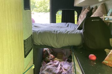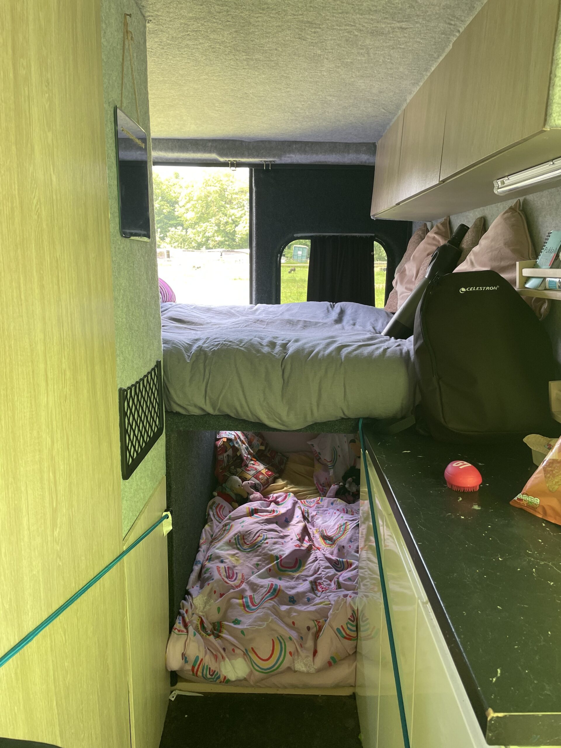 In the sleeping area there is a fixed double bed and a fixed single bed (which sleeps 2 young children – ours are 10yrs and 7yrs and fit lovely.)