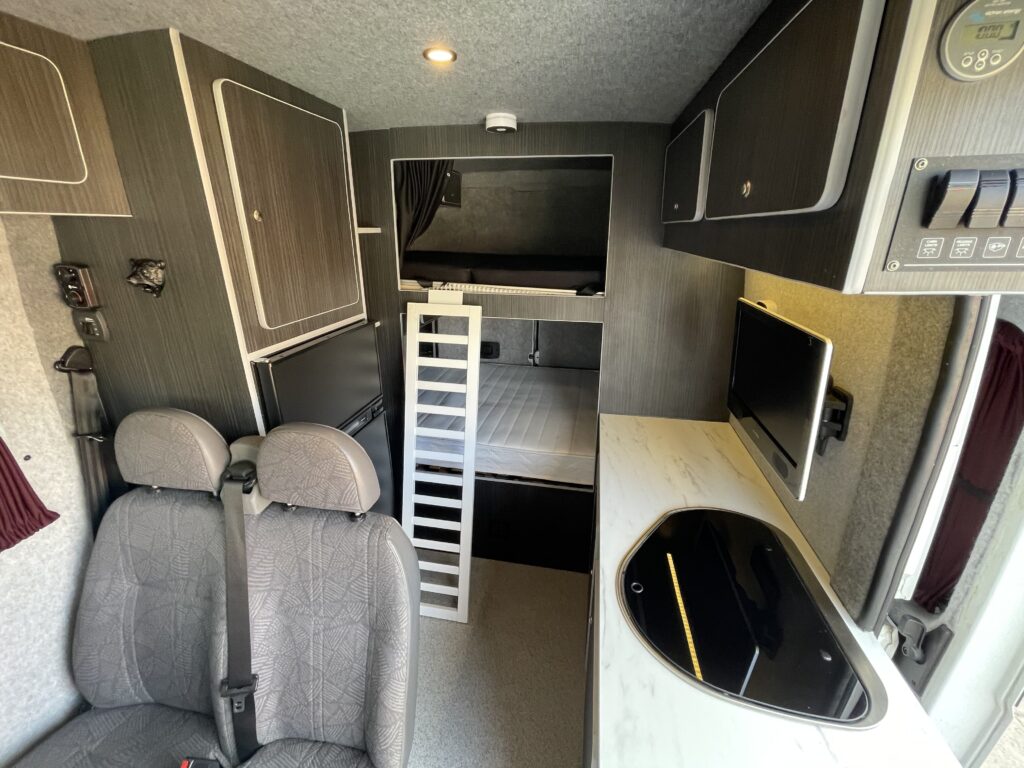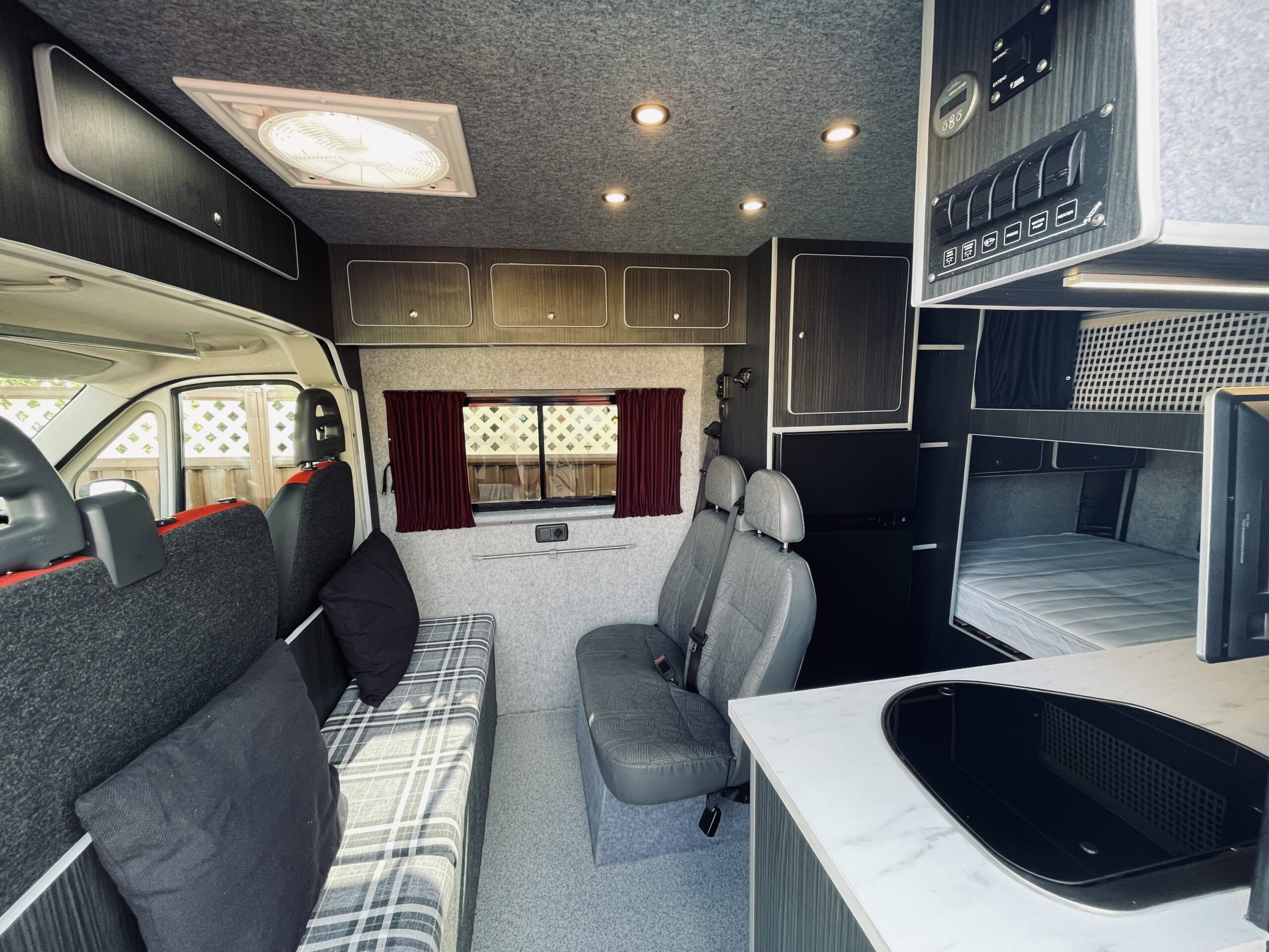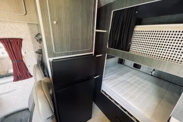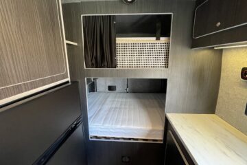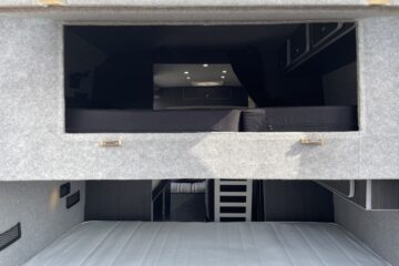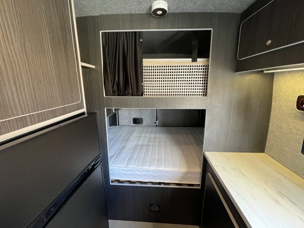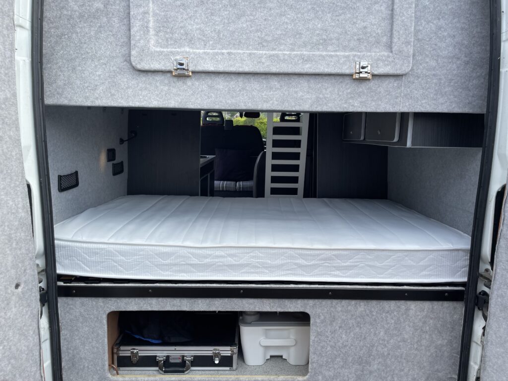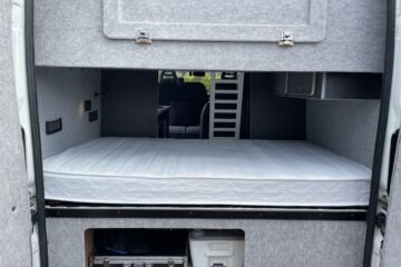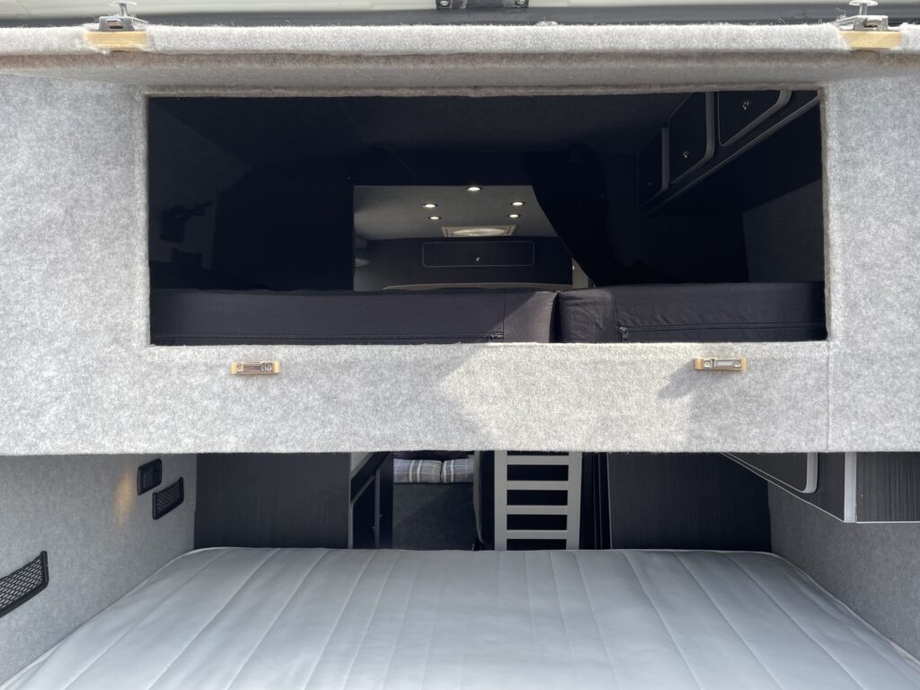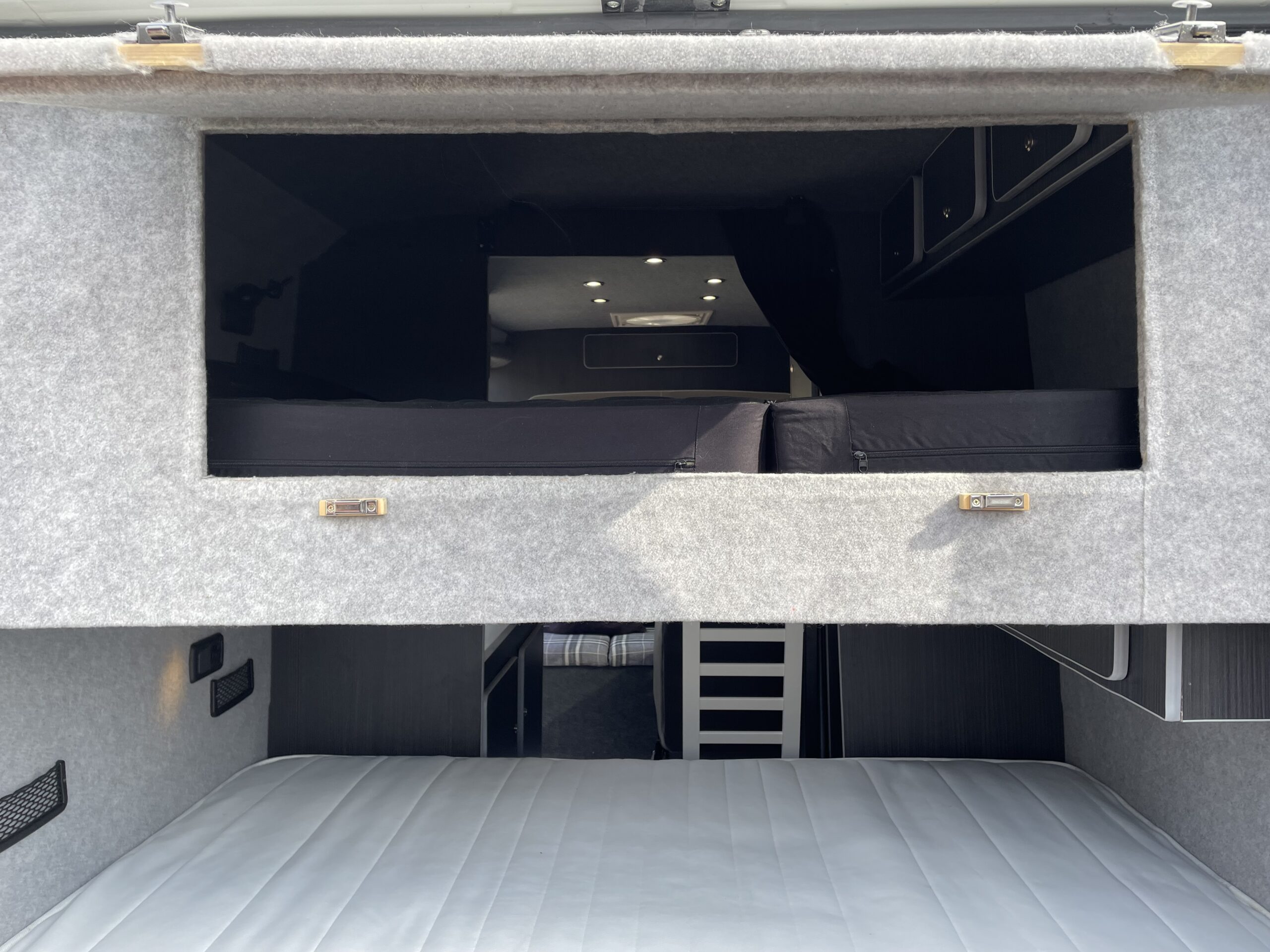 Upper bunk is boxed in, but an access hatch is available when the back doors are open. This means that the upper bunk is pitch black, even in daylight.