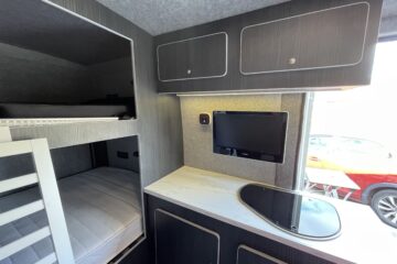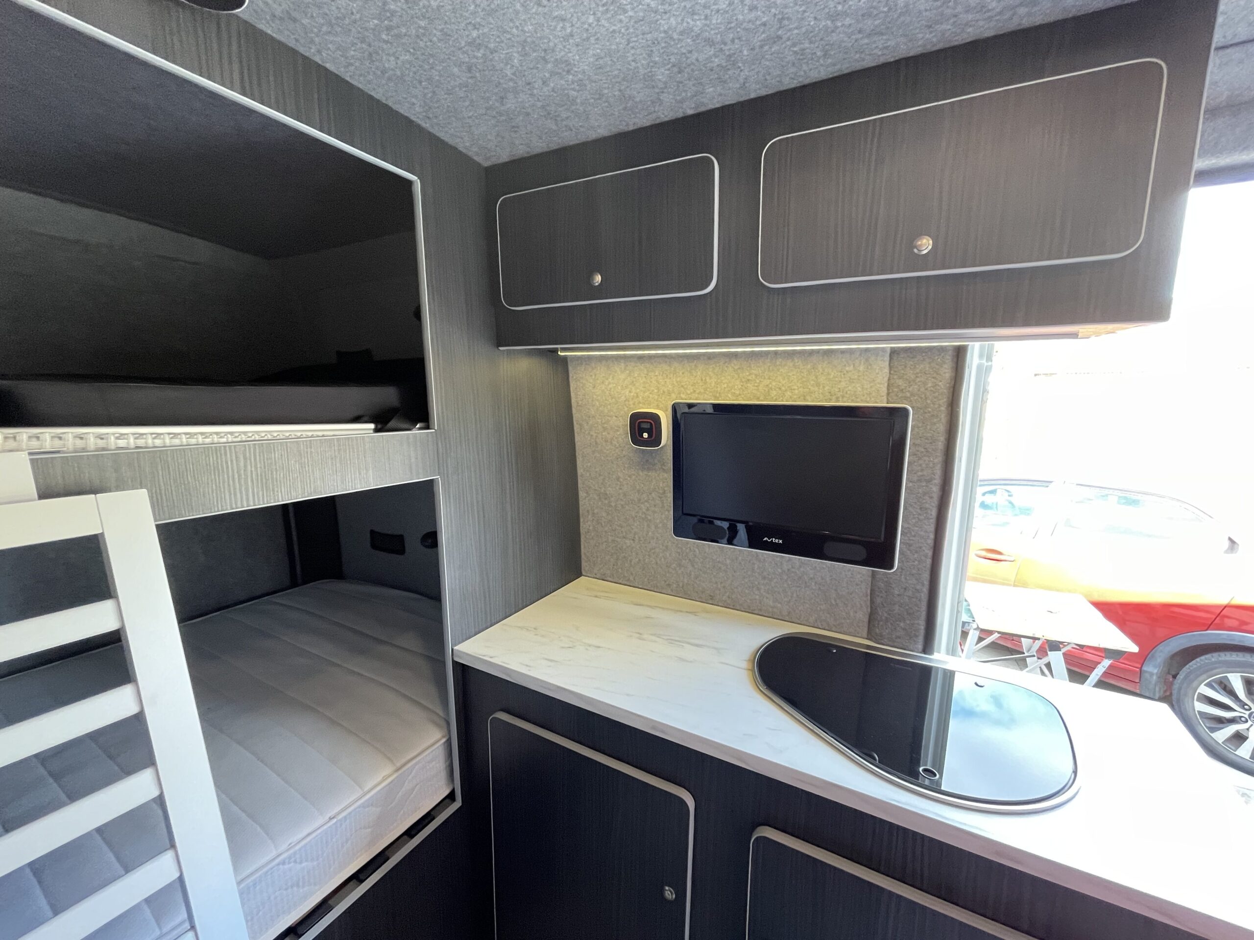 Lower Bunk is perfect for the parents or 2 adults. Above Bunk storage units. x2 USB sockets, x1 12v socket and x2 slim pockets for mobile phones.