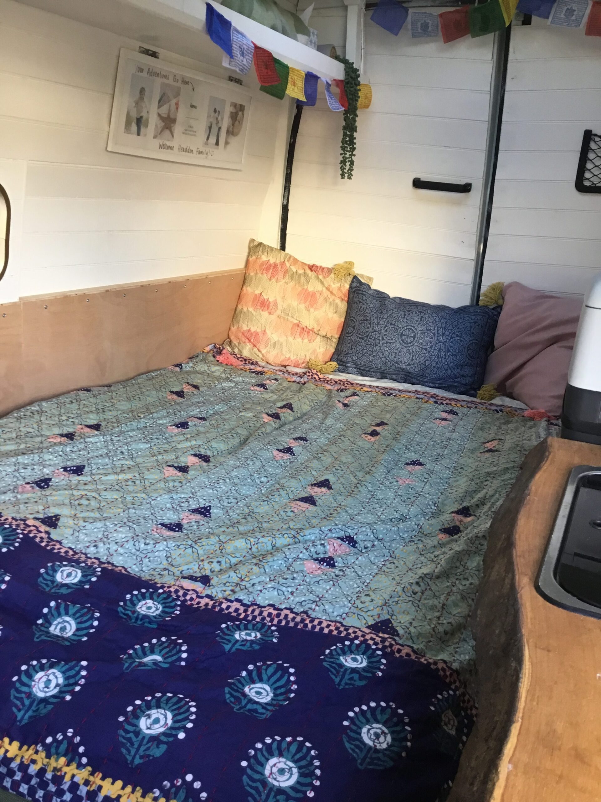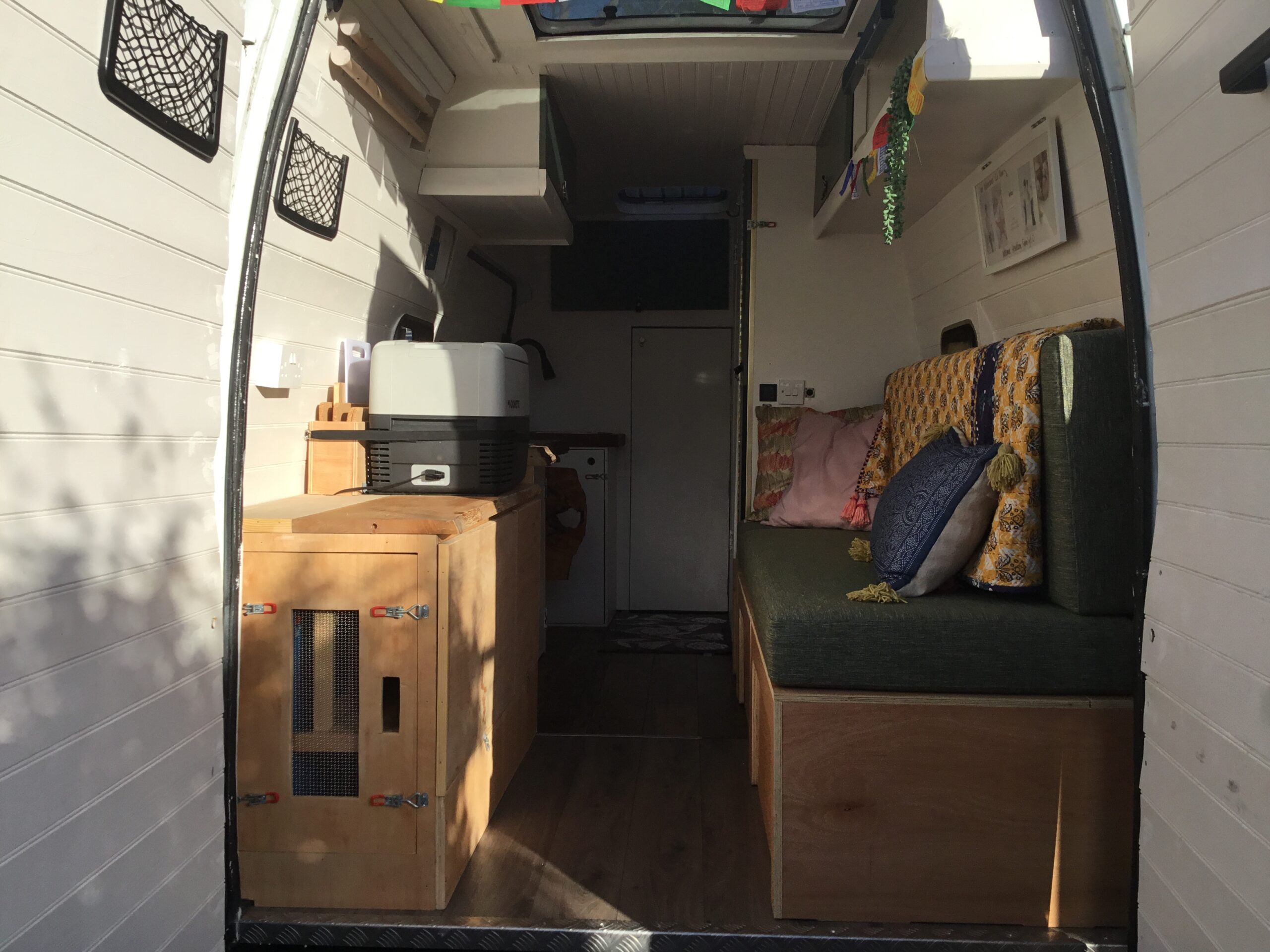 Pull out bed system extends to 2m. When pulled out there is still space to stand and cook and floor space for the dog! Bespoke professionally upholstered cushions.