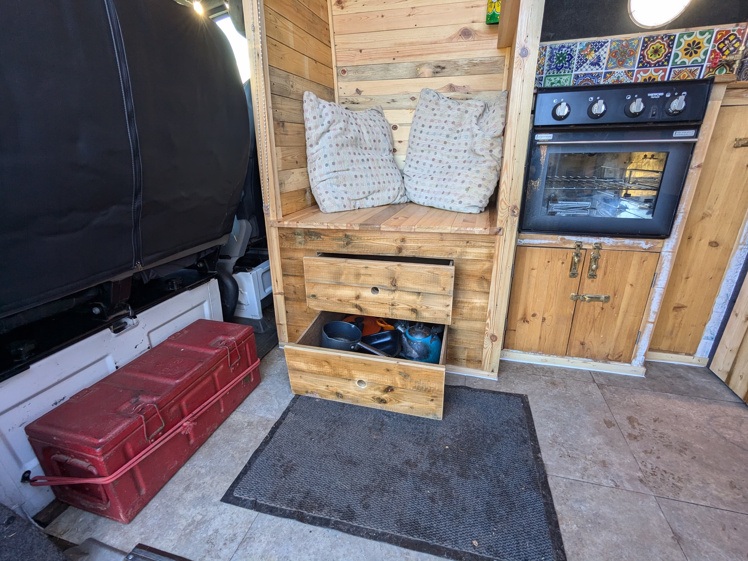 The JustCampers cool-box style 12v fridge can be pulled out creating a compartment suitable for a dog bed.