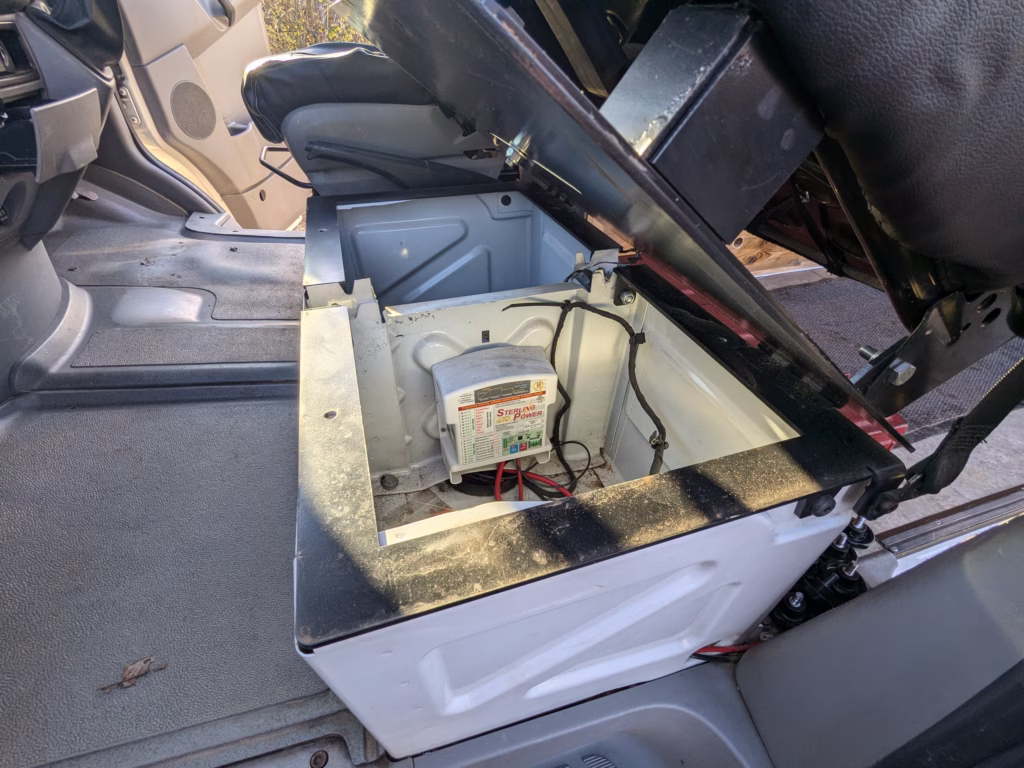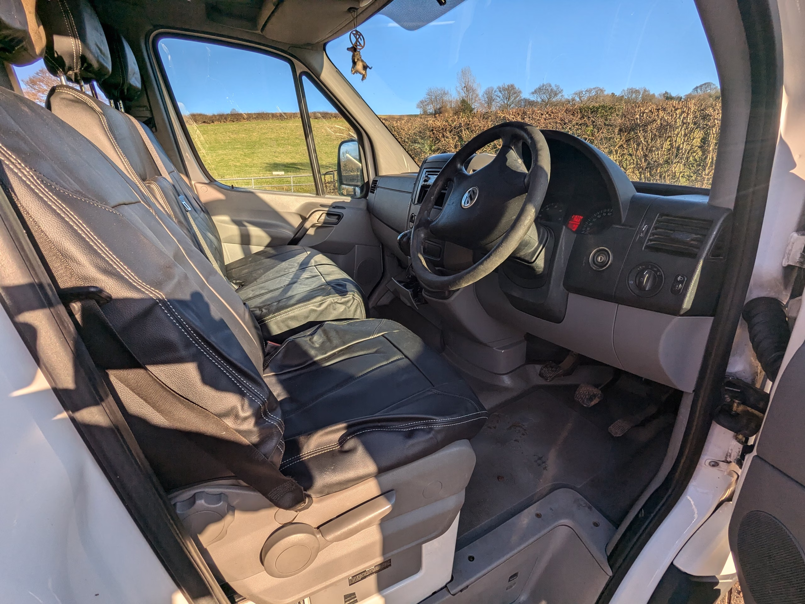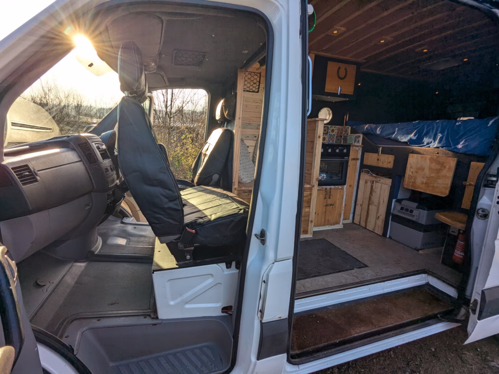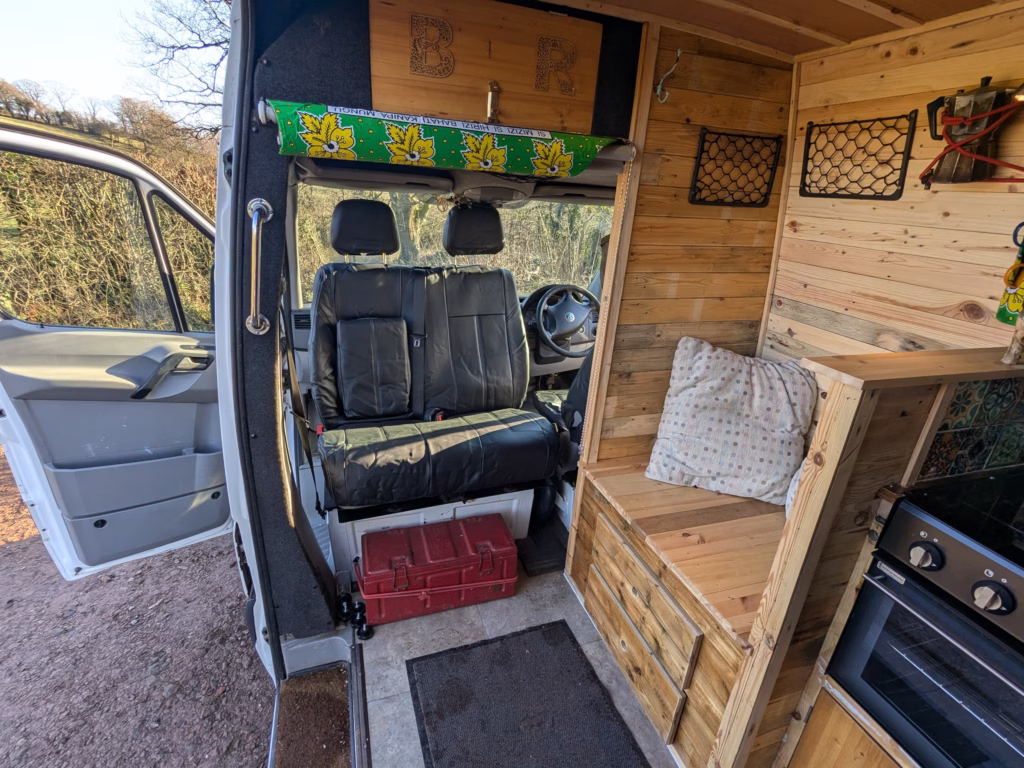 Cab bench seat is on a swivel base, so can be turned around into the living area