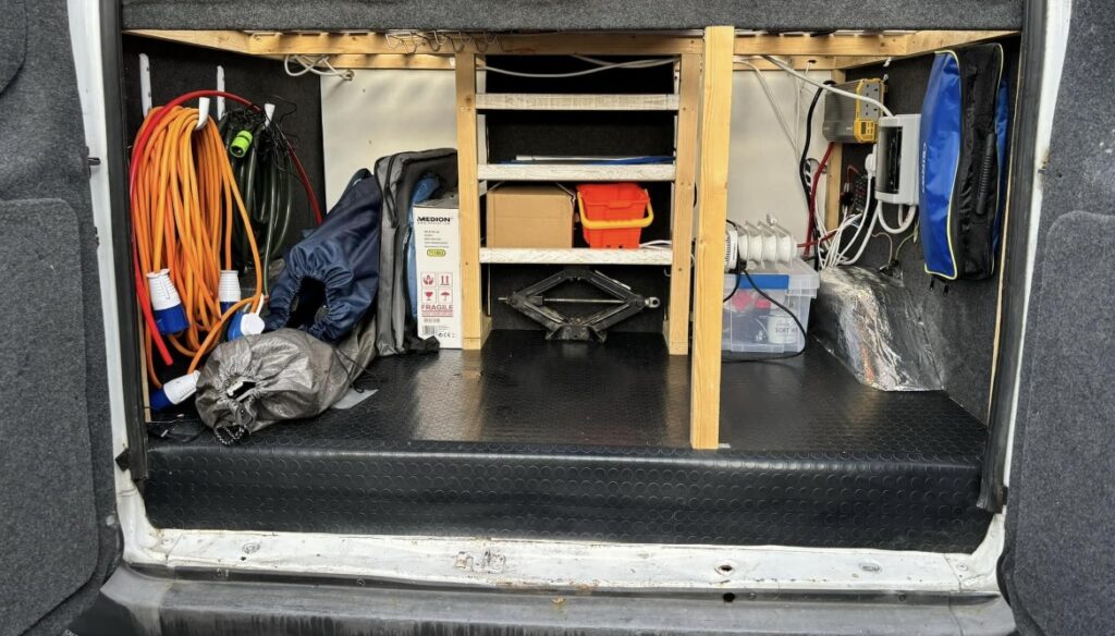 Large under bed garage storage, with shelving and racking- accessed by the rear