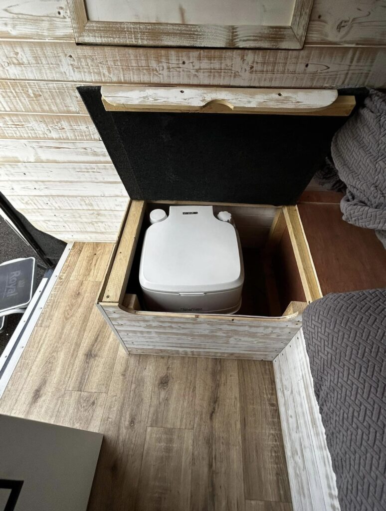 3 fixed seats with under storage & portable toilet space