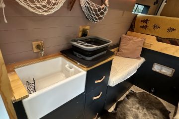 External Van features: Romac Alloys w/ AG Grabber all terrain tyres. Rear air suspension. 30L underslung LPG gas tank (accredited installation by 3rd party). LED roof lightbar, Rear wheel carrier from wheeliams – installed by professional engineer. Thule awning, Black Raptor ultra tough paint, Lanoguard under van rust prevention, external LPG point, external LED lighting, side and rear door deadlocks. External surfboard/ paddleboard rack (removable when not in use).