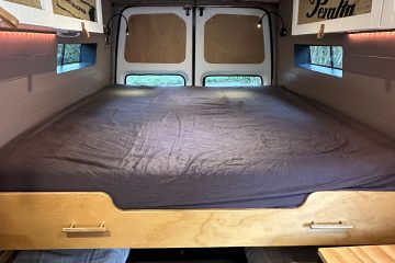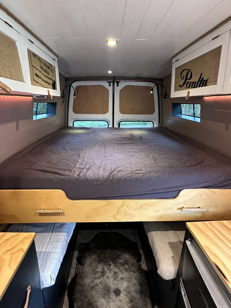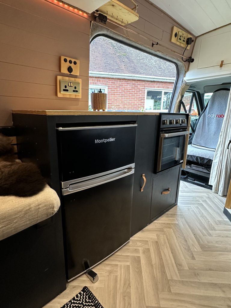 Internal Features: Fully insulated, rockwool and foam board, vapor barrier, 3 burner Thetford gas oven and hob, Montpellier 60L fridge and separate freezer, Maxx Airfan, 5kw diesel heater (linked into van gas tank). Larger than king size orthopaedic memory foam mattress, made by customsizebeds.com on custom made pull out bed.