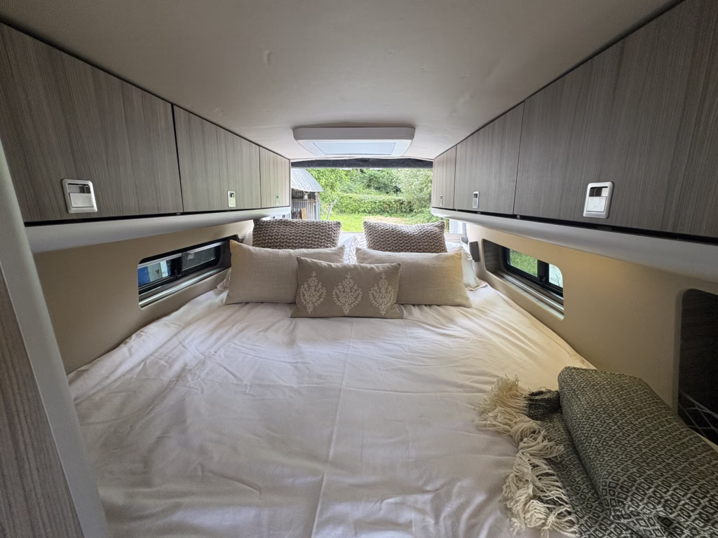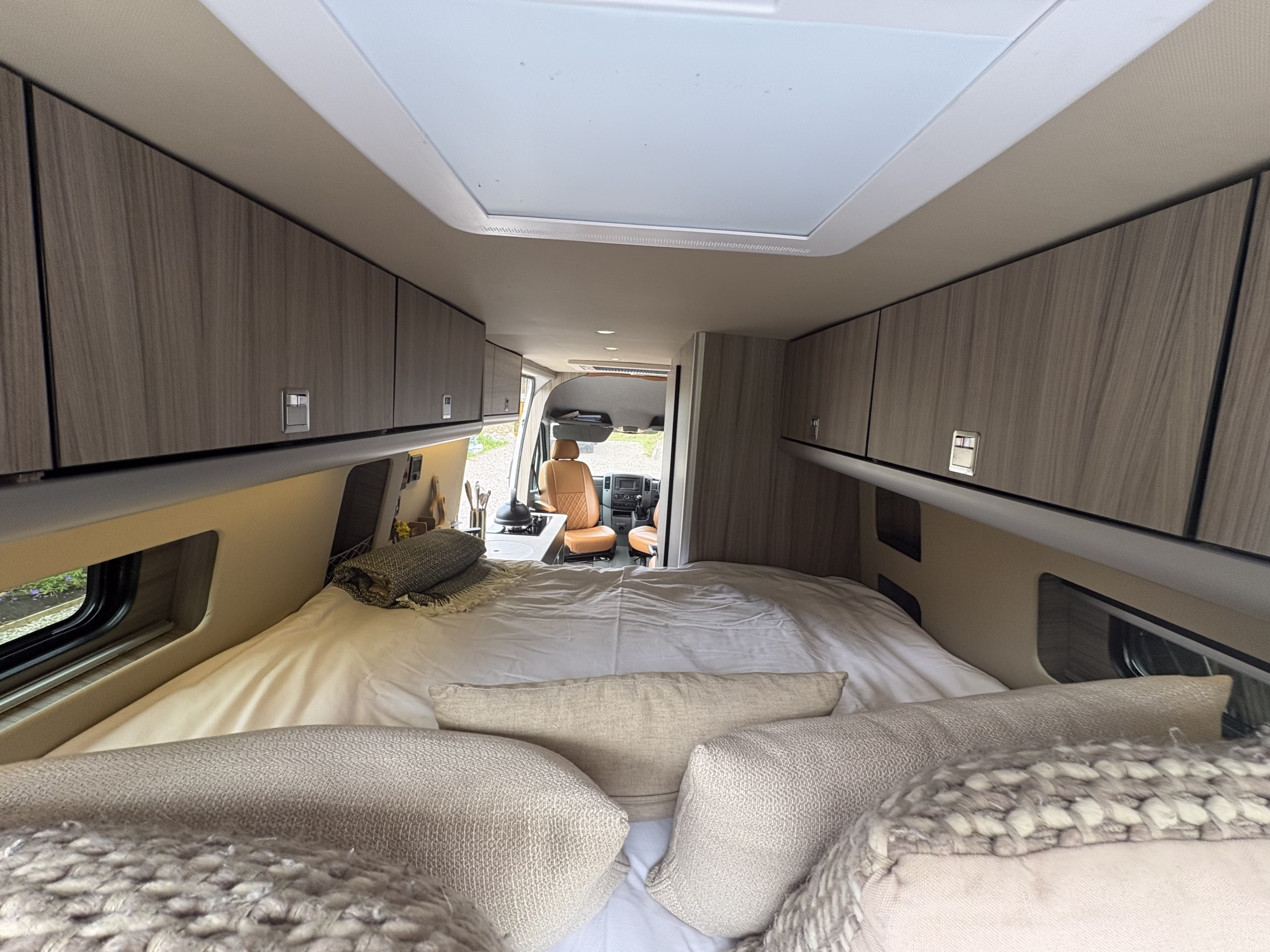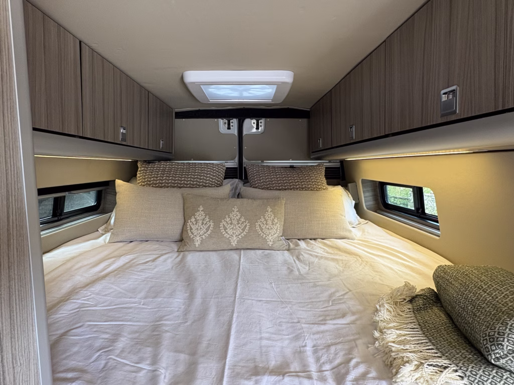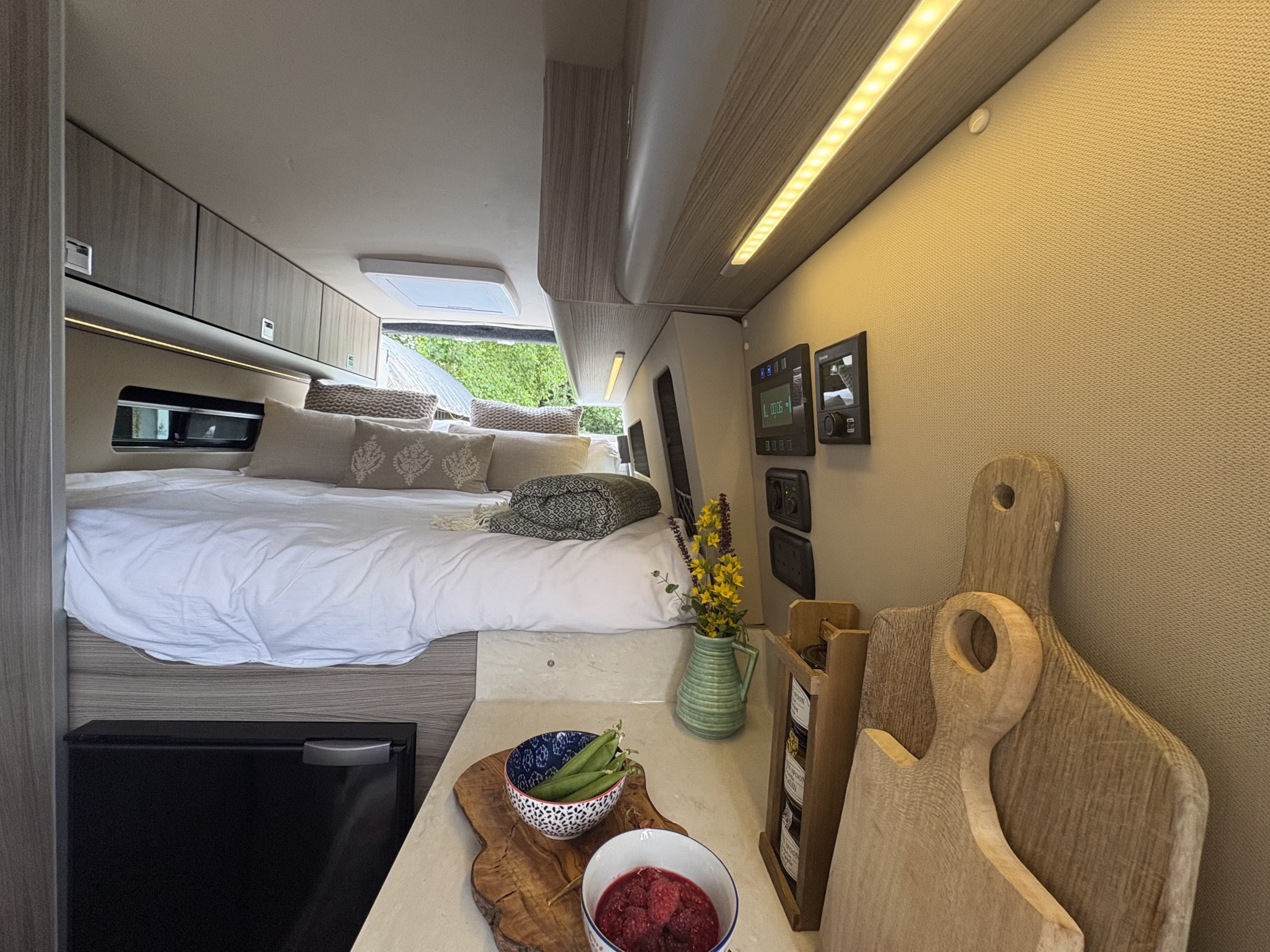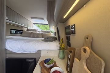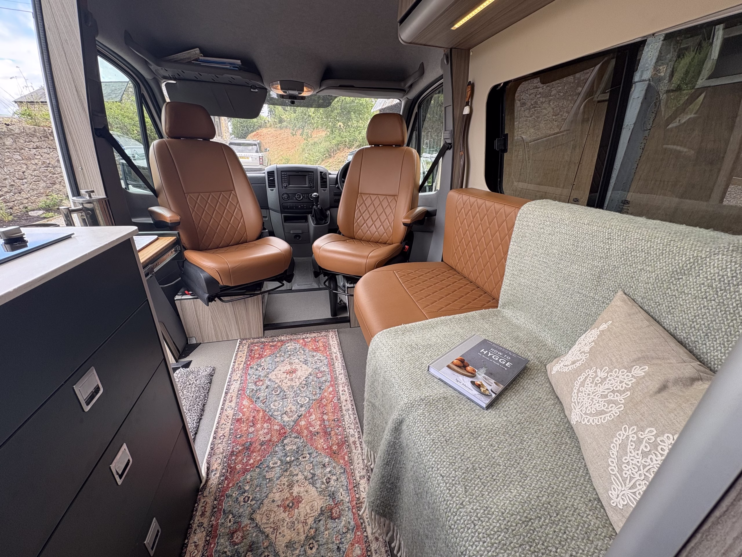 The wonderful van is fully off grid with all the bells and whistles. It is a super comfortable drive and has air conditioning in the cab area, cruise control and parking sensors. The living area is spacious with ample storage.