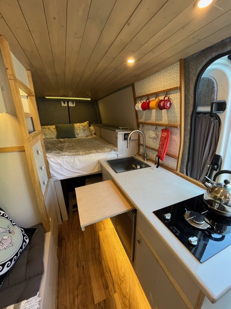 The van has a Dometic CRX50 fridge, with removable freezer compartment. There is a removable pullout countertop extender on top of the fridge, which is extremely useful for preparing food or drying dishes.