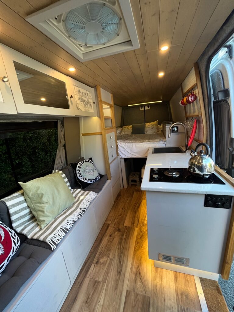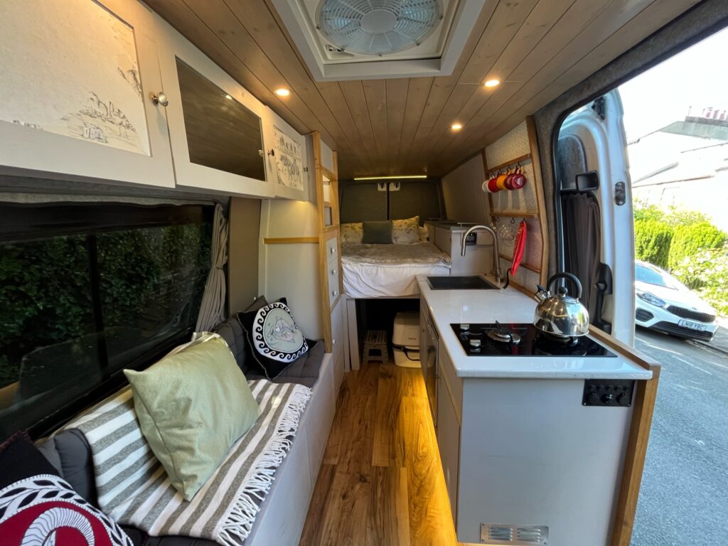 The kitchen has a square Voilamart stainless steel sink with accompanying extendable stainless-steel tap (the tap may need to be replaced). The water for which runs off a Shurflo Trail King 10 pump fed by a 10l tank. We do have a 100l tank which we initially planned to install for longer off-grid journeys but found it excess to our requirements. Weβd be happy to include the large tank for free if desired.β¨The cooker is a Thetford dual hob gas burner which is connected to a 5kg butane tank. There is also a fire blanket and fire extinguisher included in the kitchen for additional peace of mind.