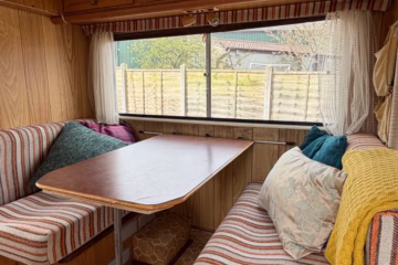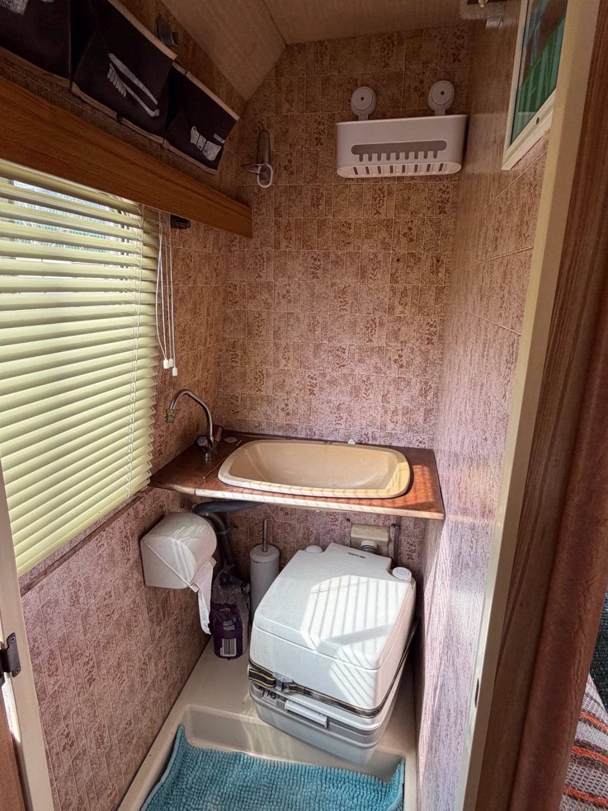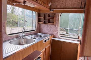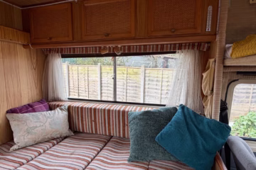 The interior offers a dining area which converts into a double bed, a kitchenette with gas hob and fridge (which runs off 12v, 240v or LPG), a wet room with shower and portable toilet as well as an overhead fixed double bed. There is also a gas heater and water boiler installed. This is a one of a kind camper as it retains all of it’s original features and interior.