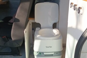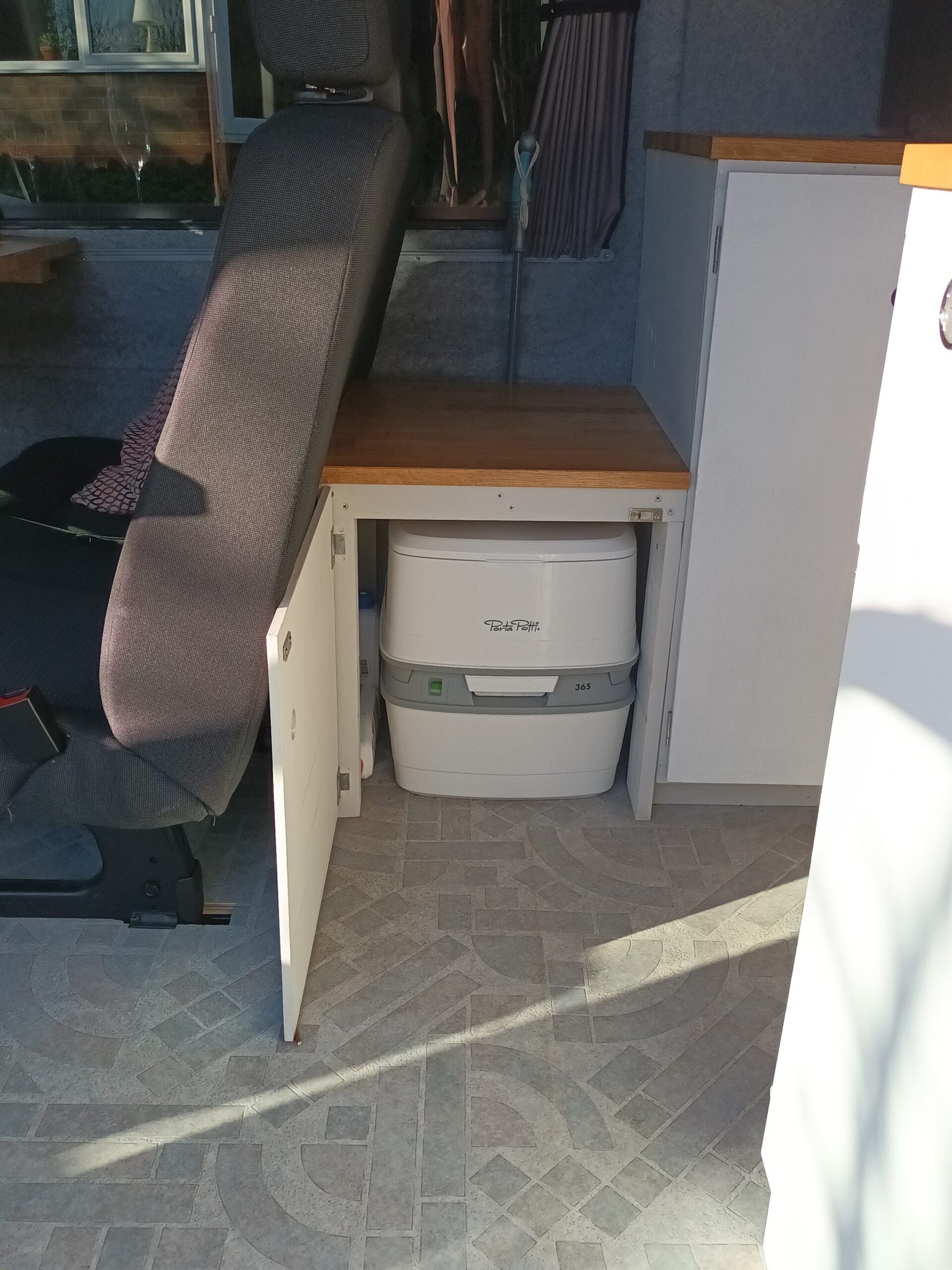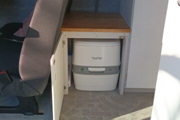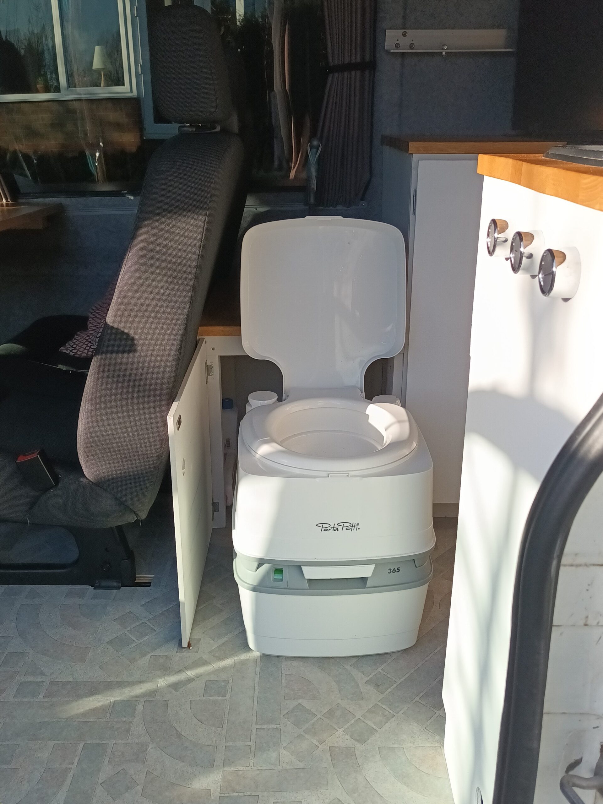 Stowed behind the rear seat and hidden away in a cupboard/ step is the porta potti toilet.