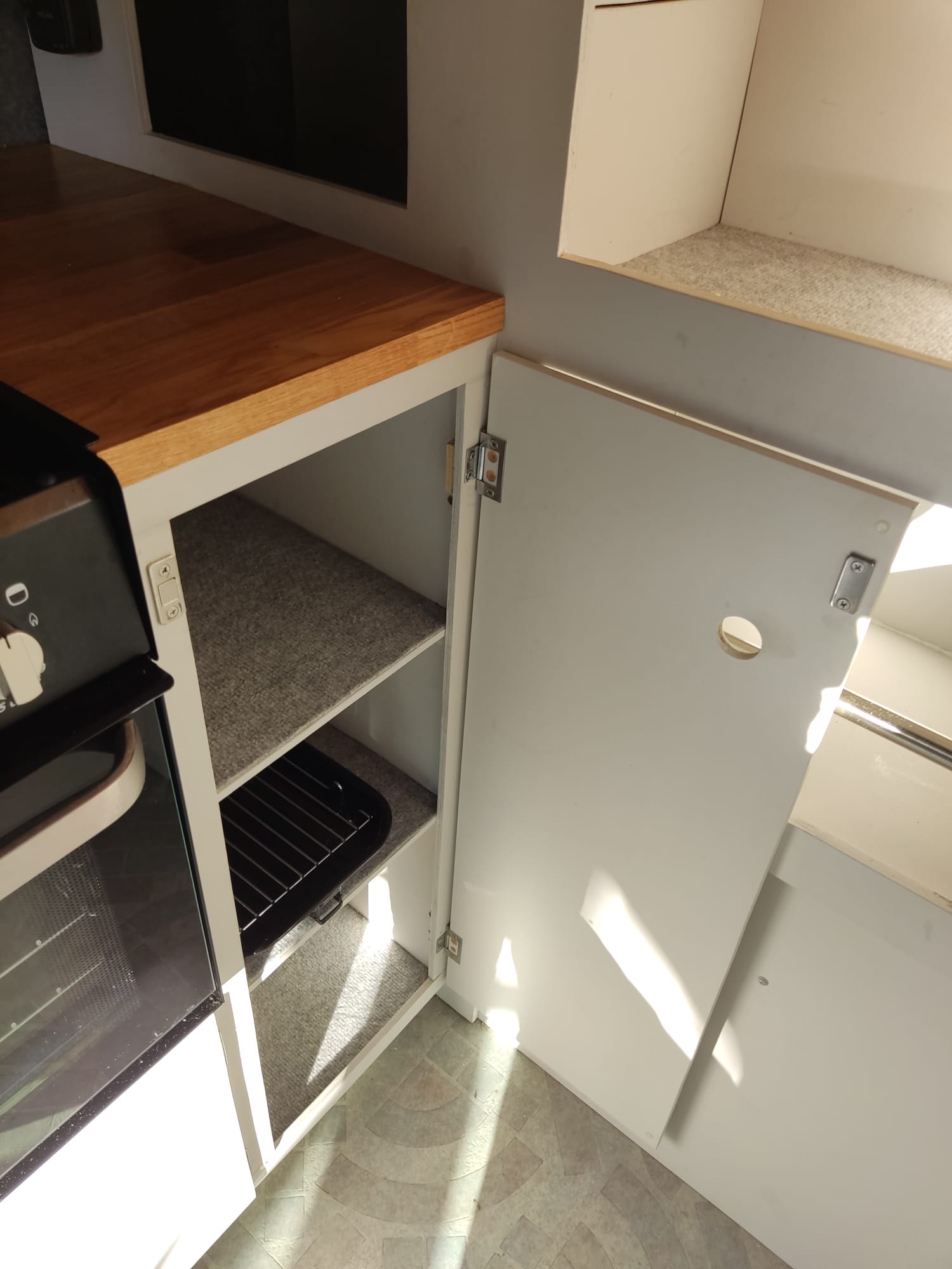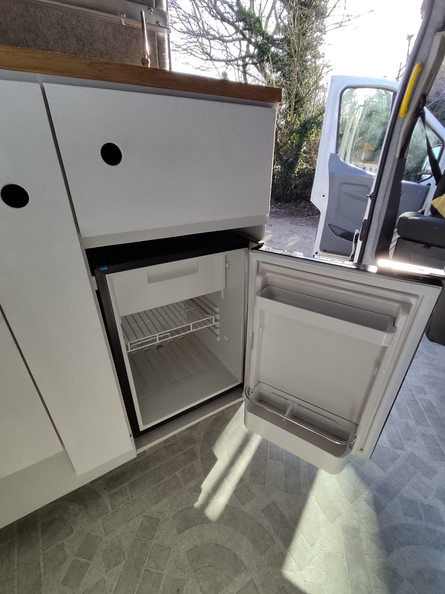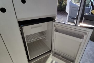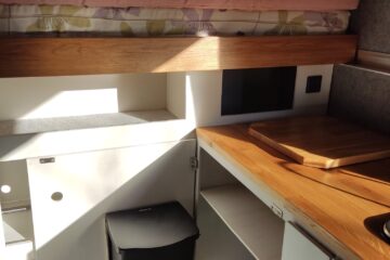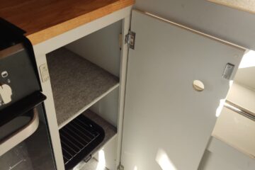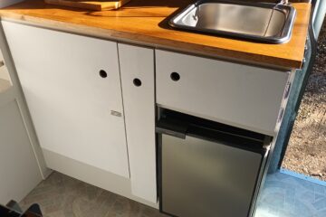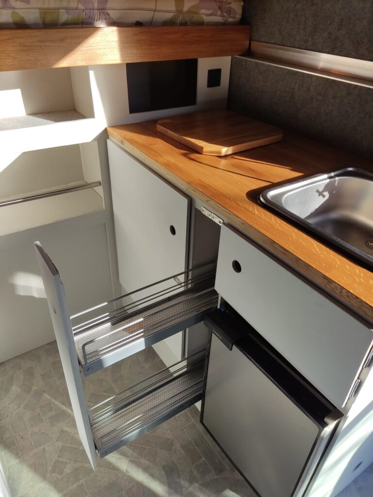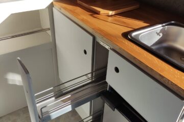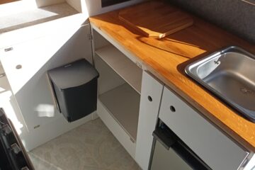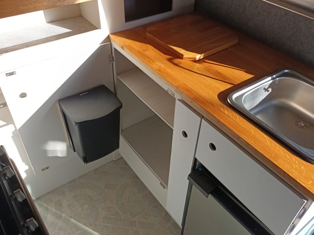 Either side of the central walkway is the kitchen area, including ample oak worktop space and storage. One side includes a Dometic CRE 50 Fridge. 50 litre capacity with optional freezer draw. A sink with a water pump powered cold water tap. A pull out bottle rack and a large cupboard with door mounted waste bin.