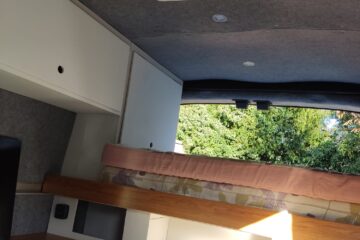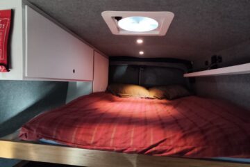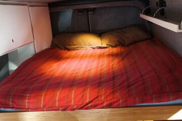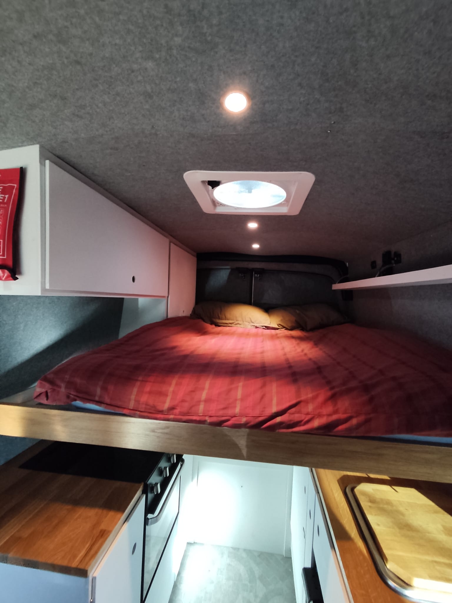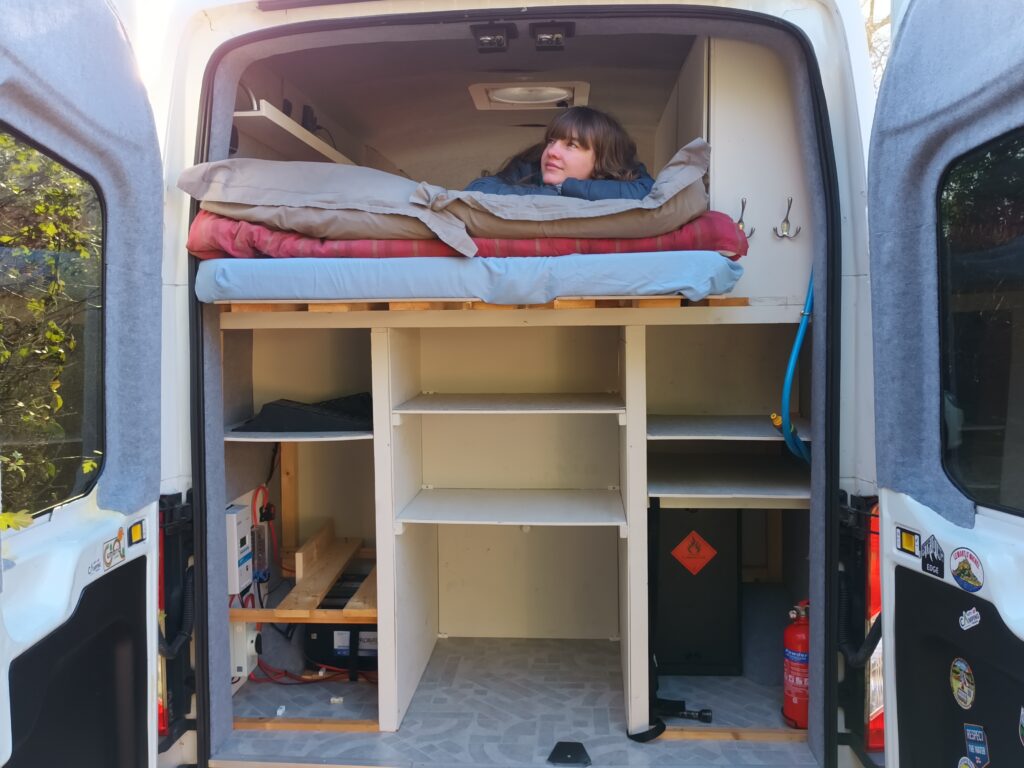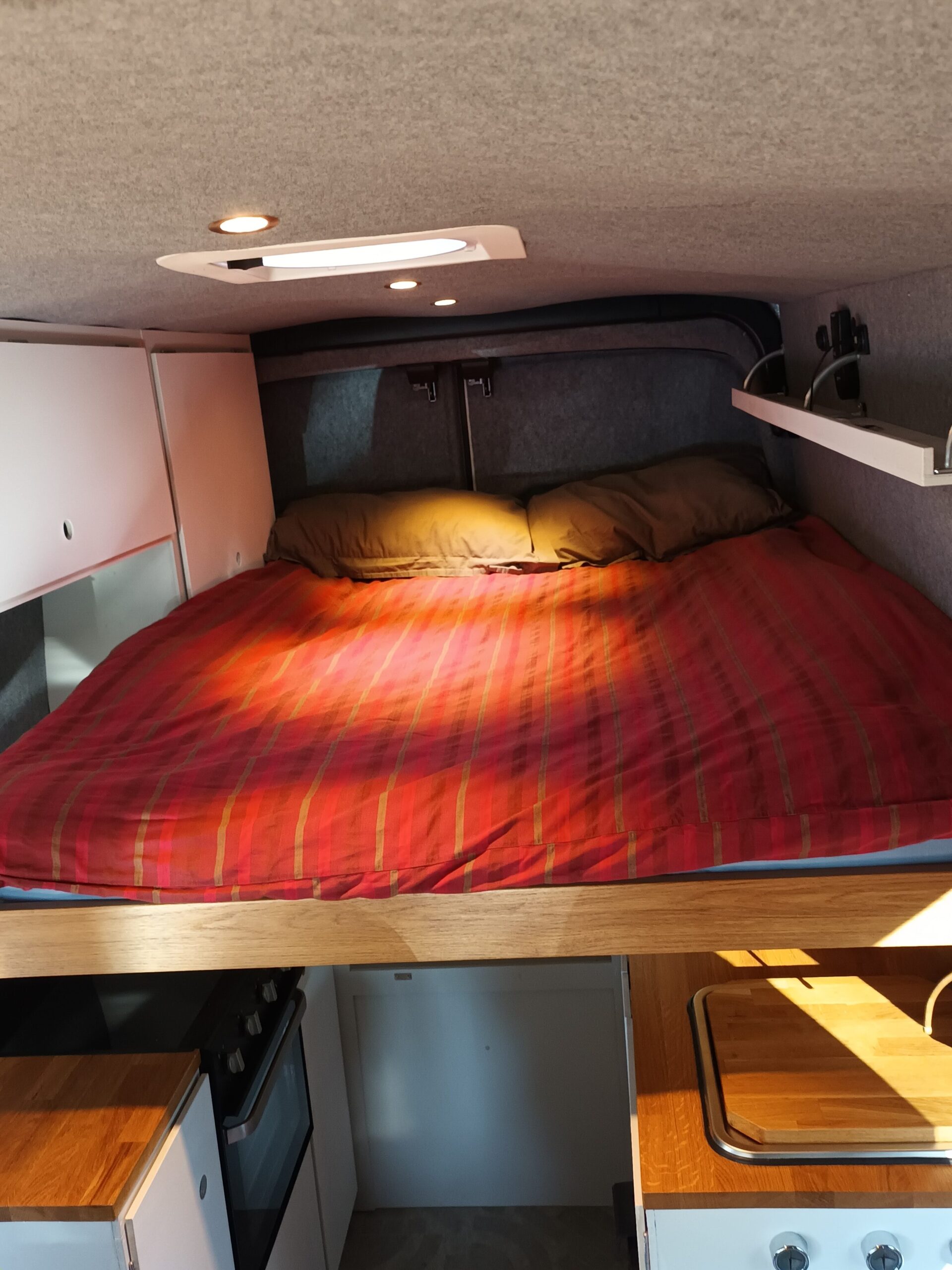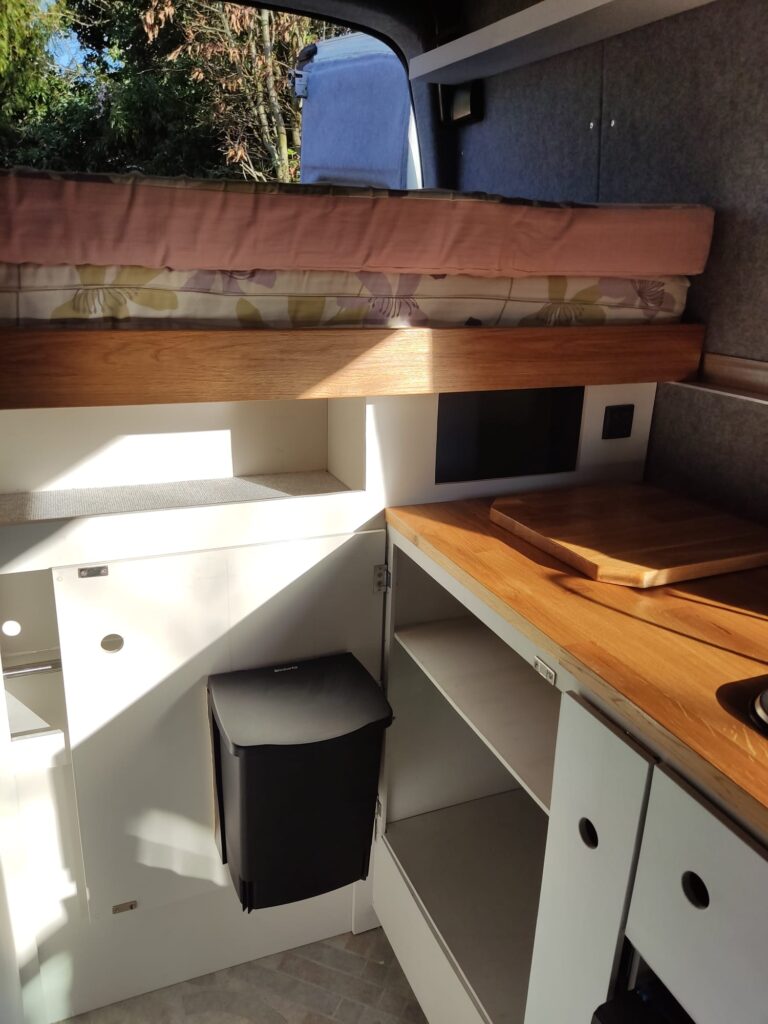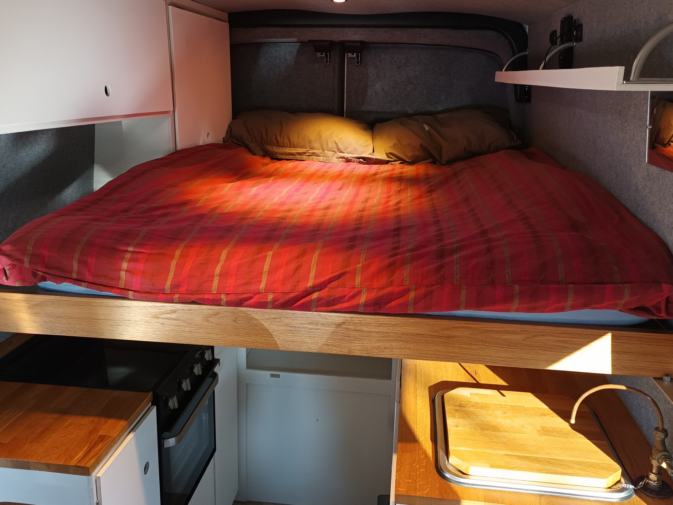 The rear of the van incorporates a high double bed. The bed slides out at night over the top of the kitchen area and retracts in the day for access to the kitchen.