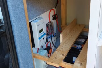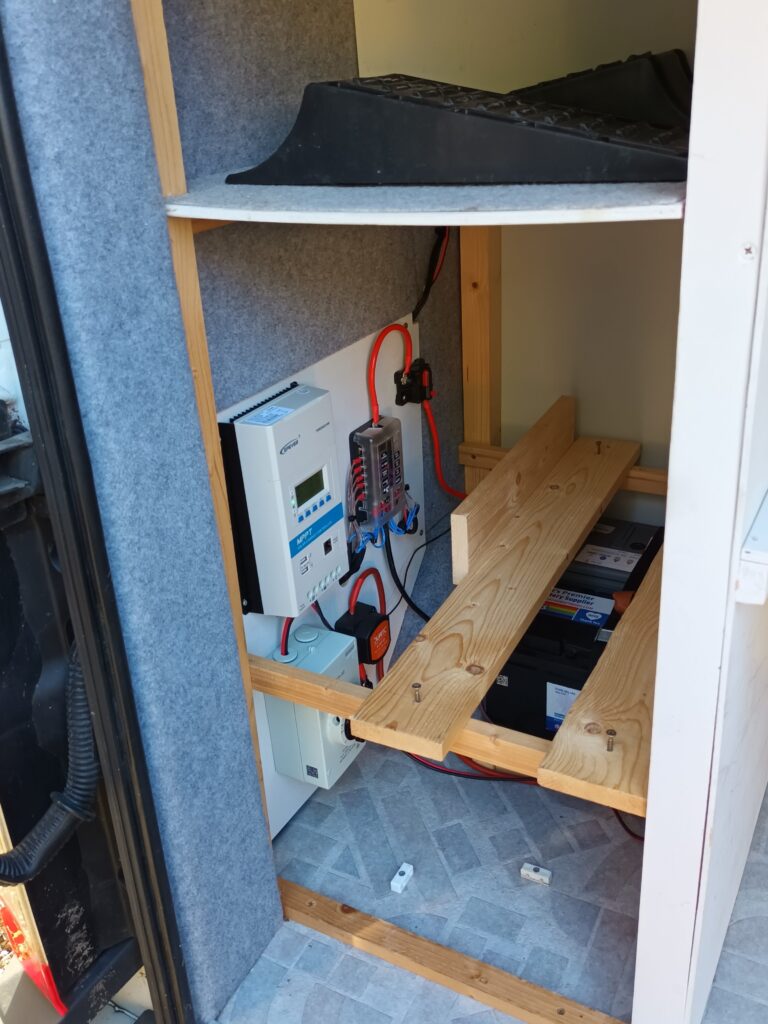 – twin 150 watt Roof mounted solar panels controlled by an Epever Triron MPPT solar charge controller