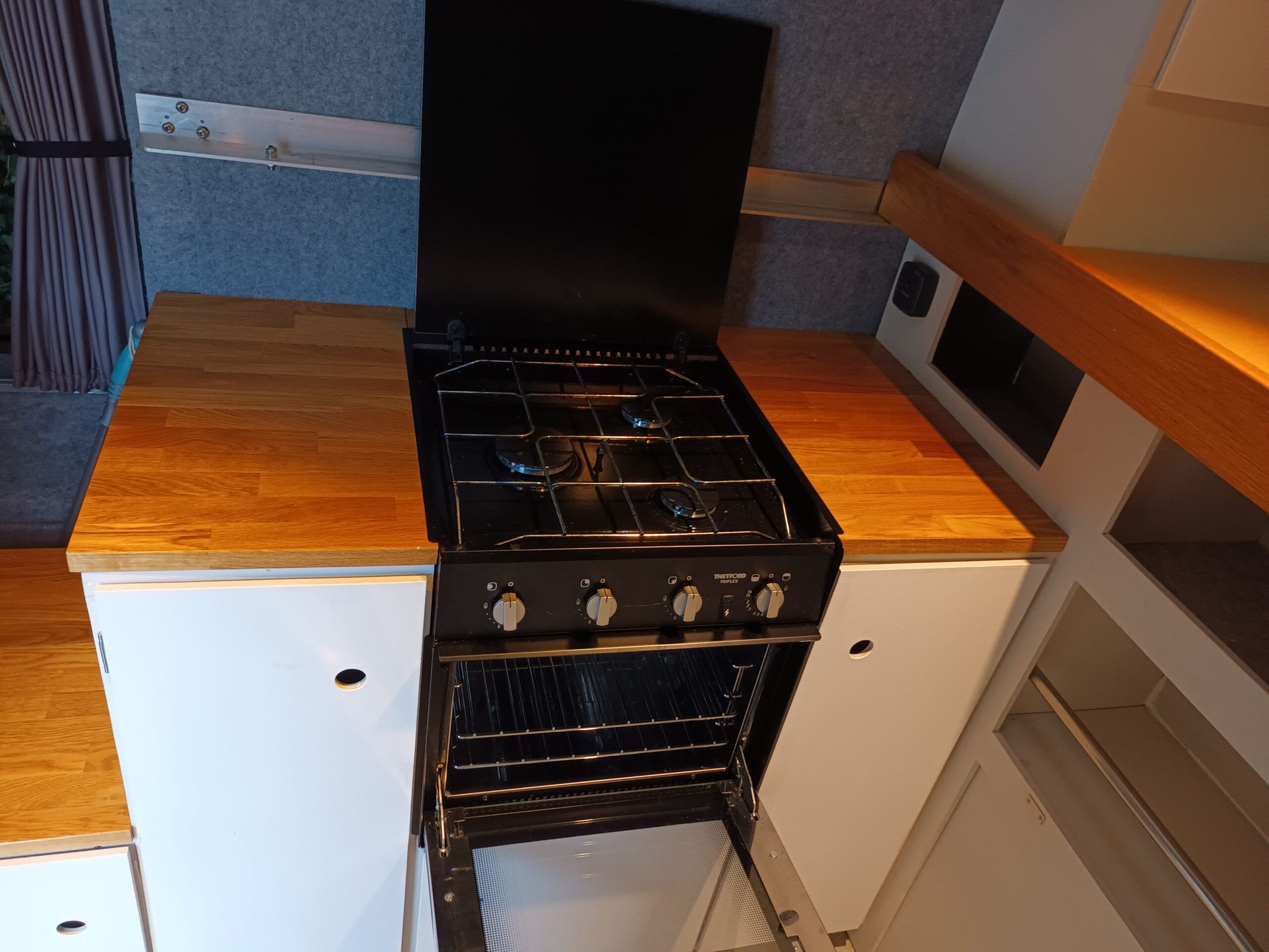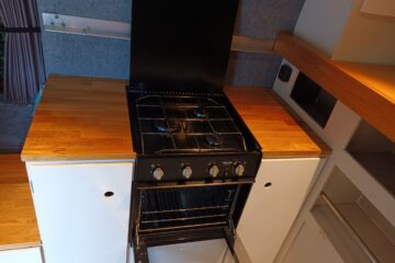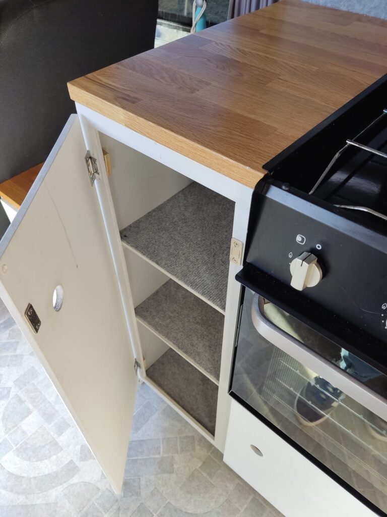 The opposite side includes a Thetford 3 ring hob with oven and grill. Gas is supplied via a rear mounted LPG bottle that is housed in gas safe locker with external safety ventilation and off tap for travelling.