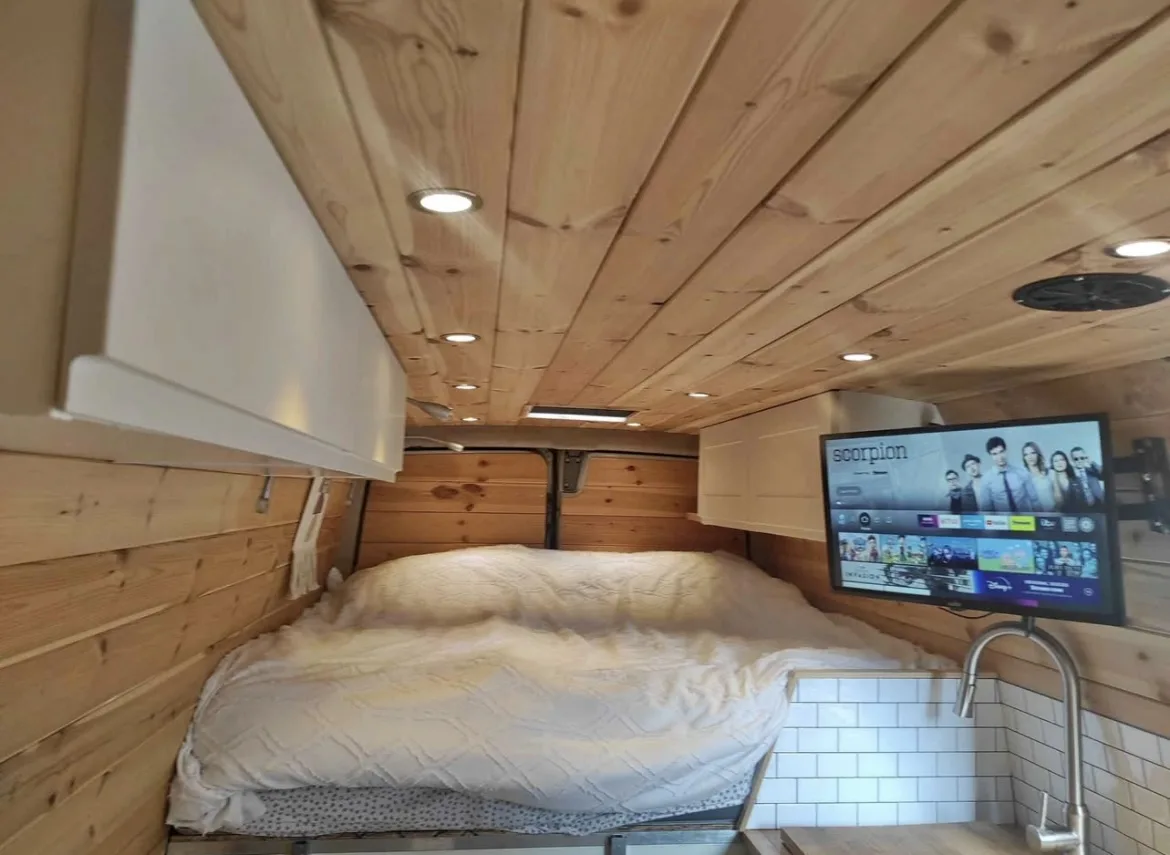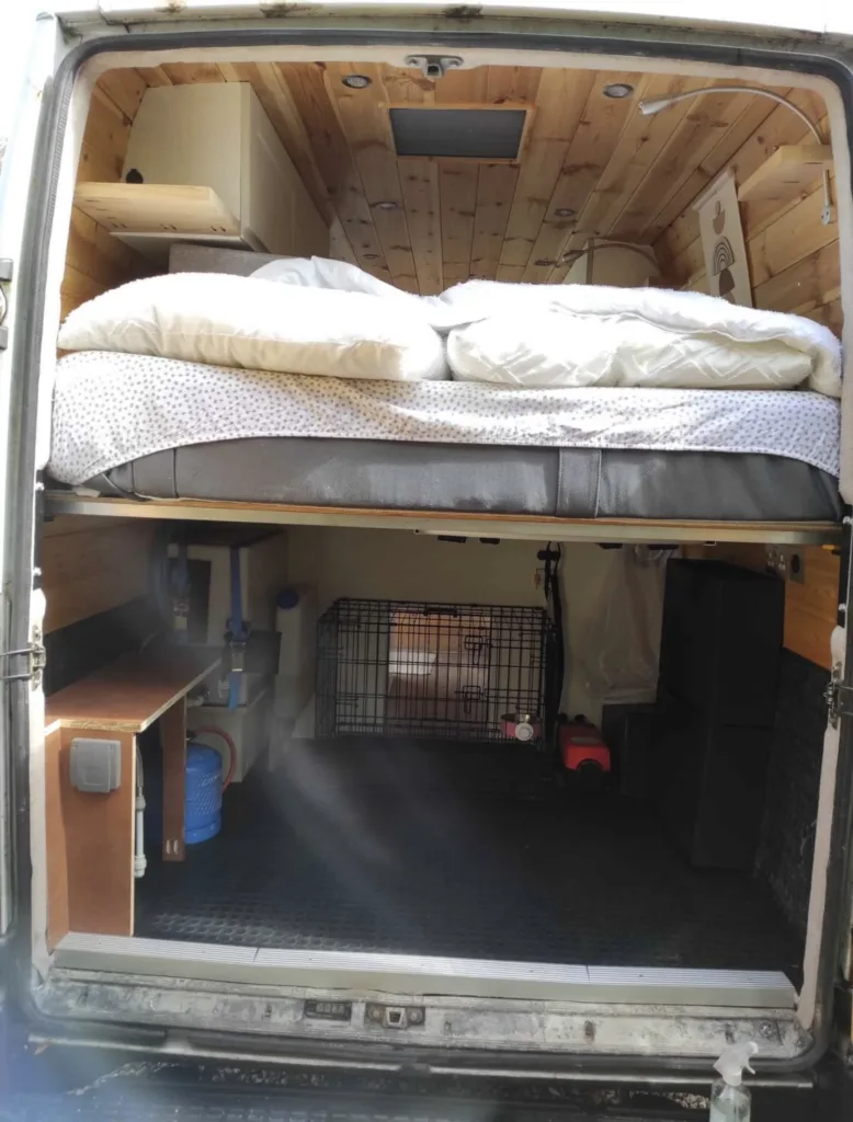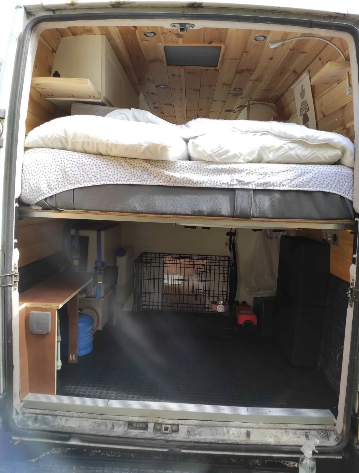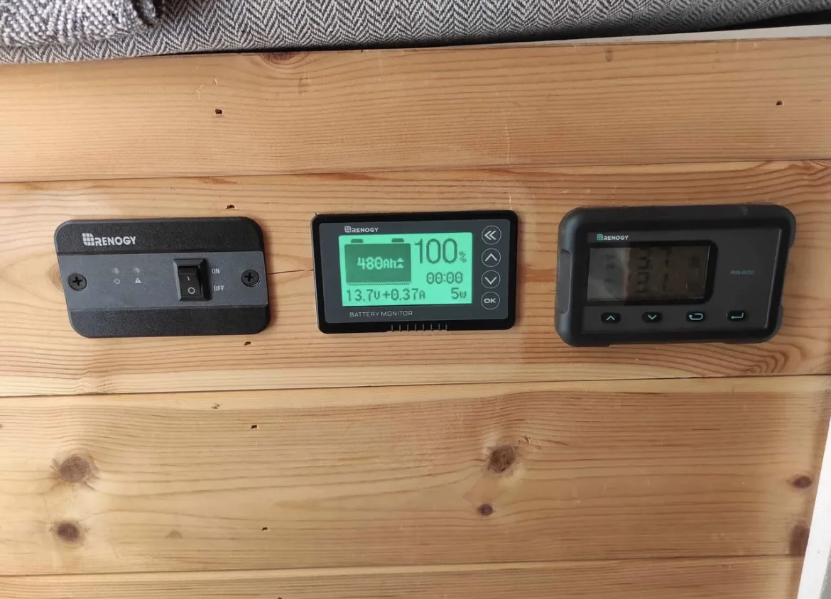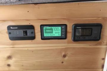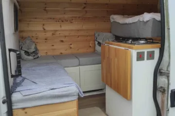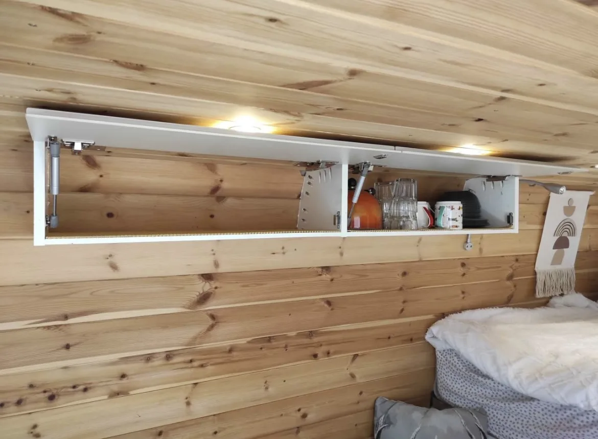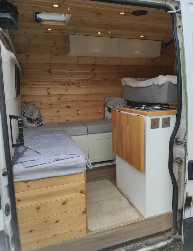 Fully insulated using PIR Insulation board and recycled plastic bottle insulation in the cavities. It then has a foil vapour barrier to stop any condensation. All the cupboards and furniture have been built from scratch to suit and made to measure cabinet doors fitted. The electrical systems allows you to camp completely off grid with plenty of redundancy in the system for long periods of overcast weather.