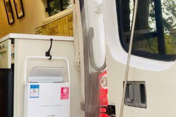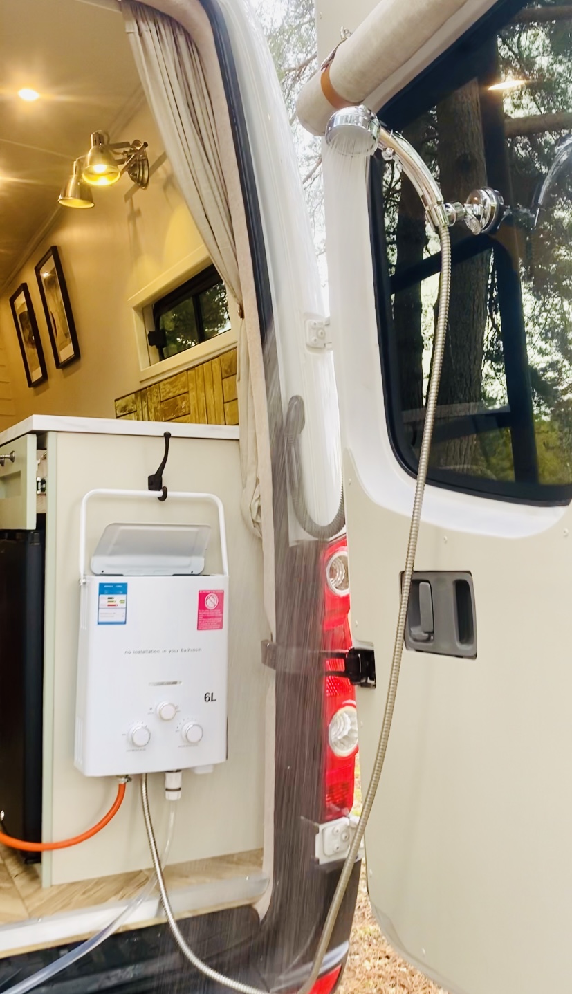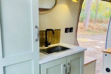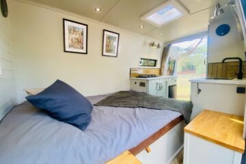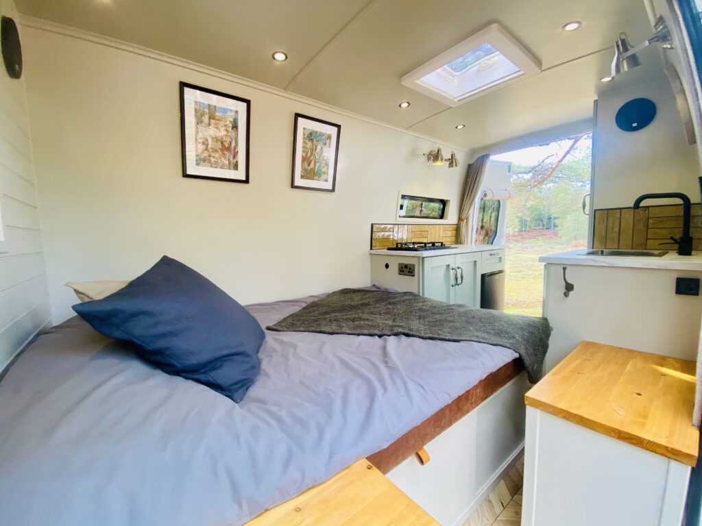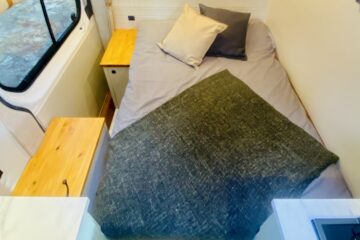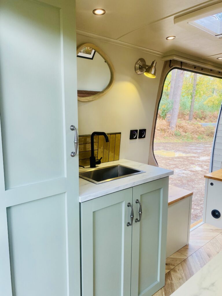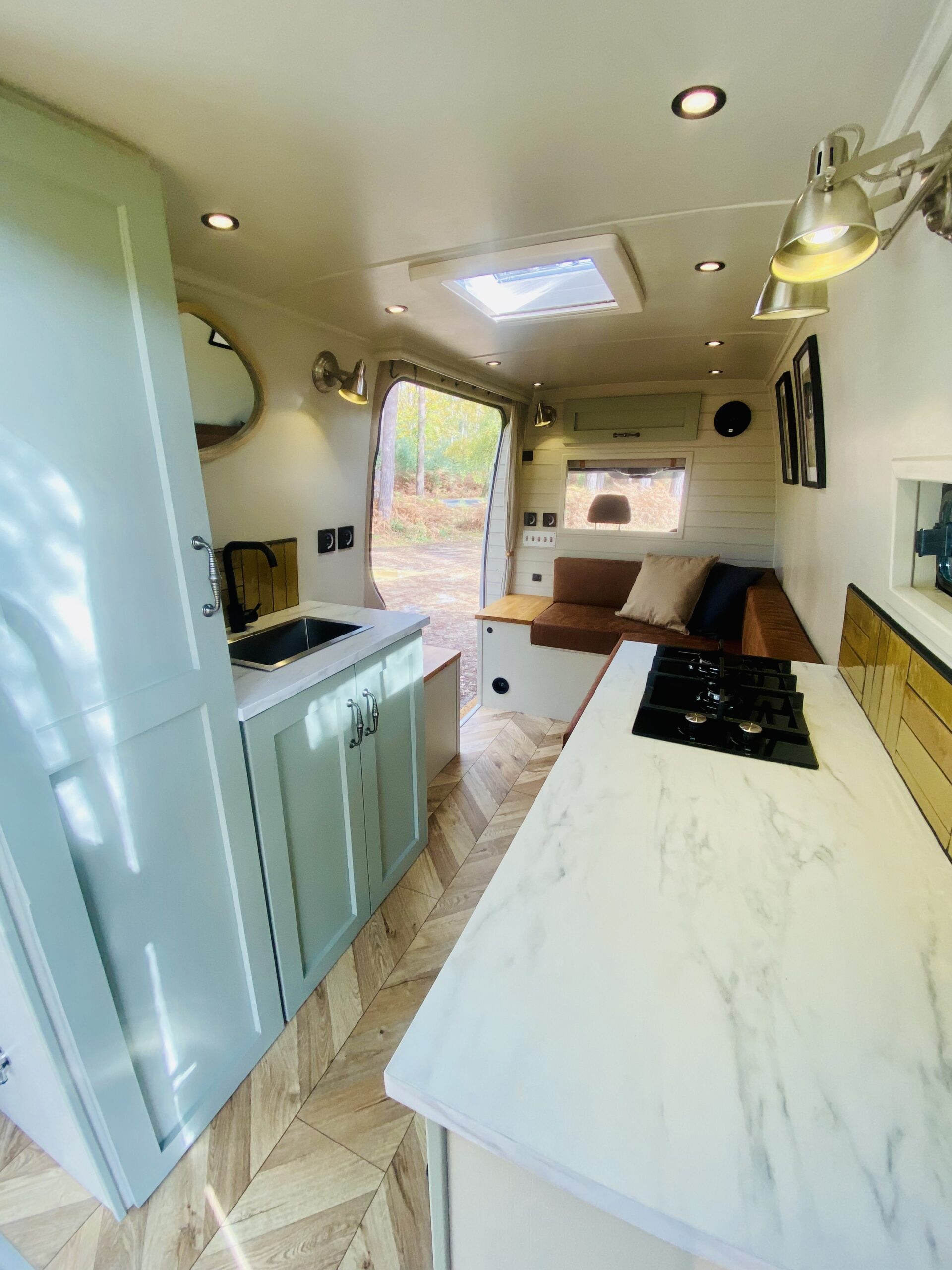 The kitchen has been lovingly crafted by hand and made from lightweight pine to create an eye catching and practical work space. A shaker style door painted in Farrow & Ball colours to embellish the kitchen frontage and is mirrored throughout the conversion. We decided to use a marble effect compact laminate worktop because of its durability and clean look. There is an ample amount of space for cooking and all other daily needs. We have chosen to pair the tops with a simple black glass 2 burner hob supplied by camping gaz (located under the sofa in a gas locker to hold 2 x bottles). Opposite to that we have a deep brushed steel sink which is perfect for everyday needs. The work space is well lit from 3 adjustable spotlights which run on their own dimmer switch. A 50L SMAD 12v fridge has been installed capable of holding all of your essentials. A 240v inverter outlet socket has been fitted on the side of the kitchen allowing you to run Blenders Etc. At the end of the kitchen we have built a top to floor cupboard which holds all of our clothes with the capability of hanging, a full length mirror on the door and complete with a compact chemical toilet at the bottom. On the side of the cupboard we have plumbed in a shower which enables you to wash from the back of the van. The hot water is supplied by a compact combi bolier which supplies instant hot water for showering. The boiler is stored away in the cupboard on its own shelf for ease of use.