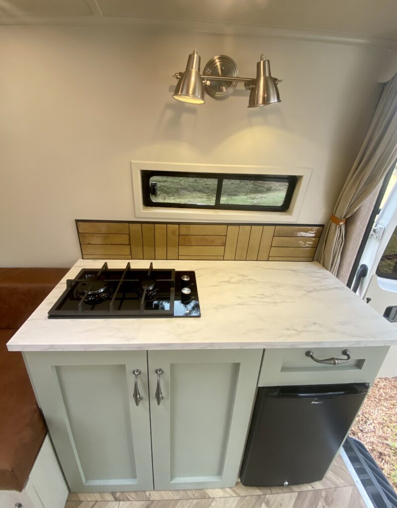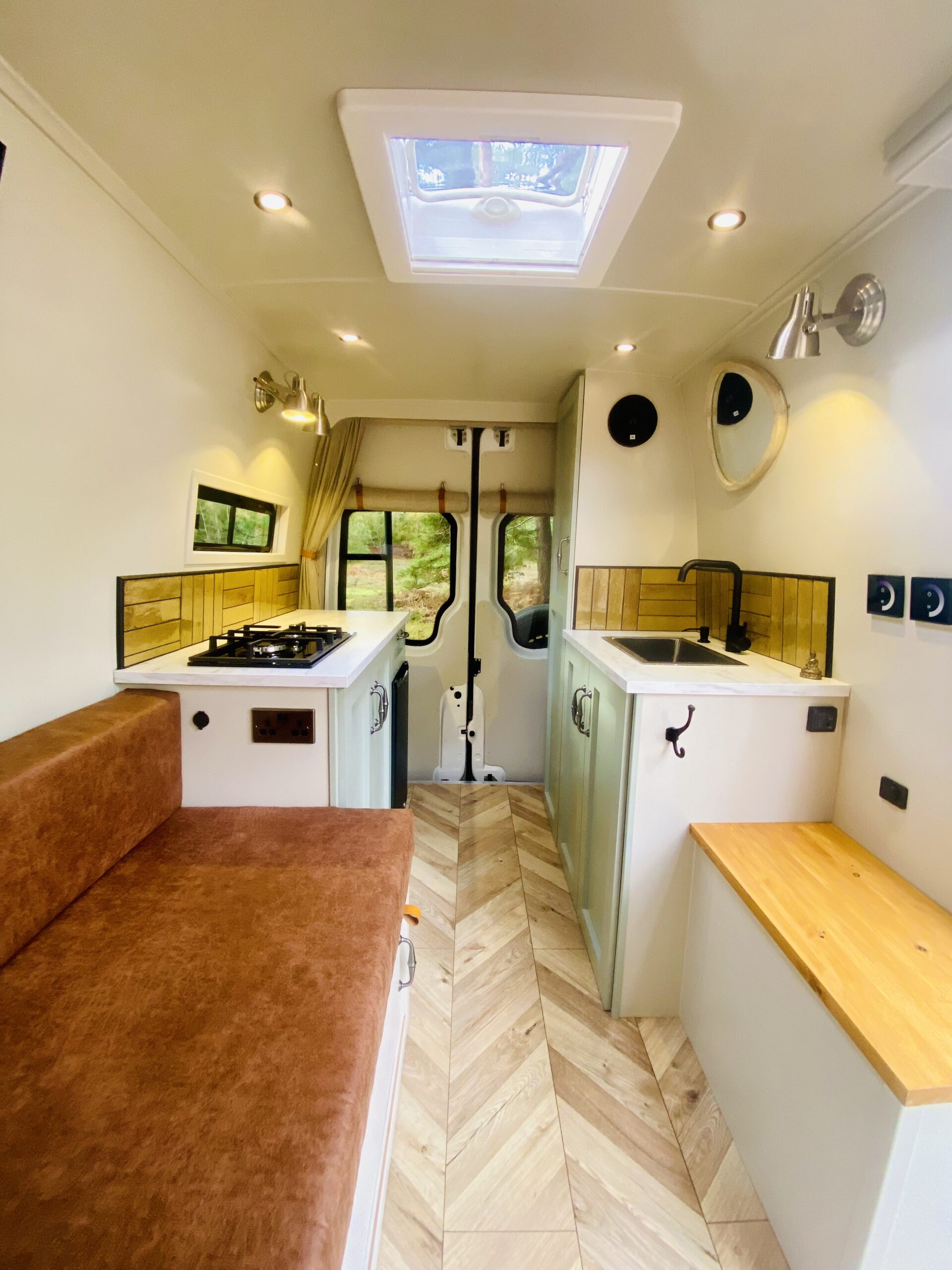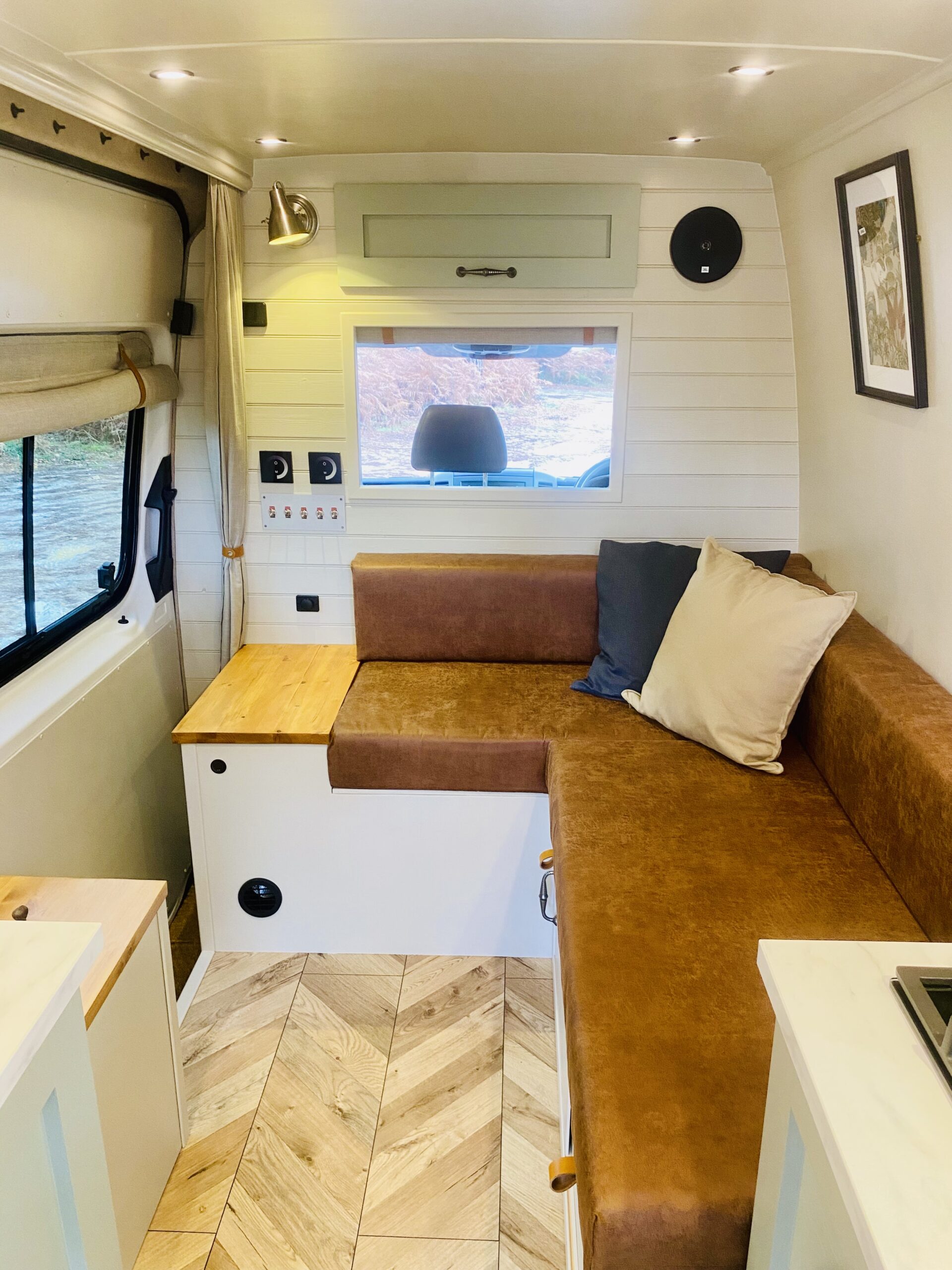From our past experience we decided that functionality and comfort are two things we would not compromise on. Taking this into account we decided a corner sofa was the way to go. We fitted 4 windows in Jelsa and a Dometic roof vent to optimise the natural light. For us it maximised the views when sipping our morning coffee and it gives us an open space to socialise. The cushions are made from memory foam and upholstered with faux suede removable covers. Not only is the sofa an amazing space to relax it also doubles as a pull out double bed capable of sleeping 2 tall adults and the possibility of one more underneath. Plenty of storage for bedding and possessions can be found under the cushion pads, one accessed from a chest style lid and the other via sliding doors. Opposite the sofa you will find the water storage compartment capable of holding 50L of fresh water. Underneath the vehicle you will find a 60L waste tank which can be emptied by the drainage tap on the rear skirt of the van. Equipment such as the sureflow water pump, sureflow filter and accumulator are found in the bottom of the sink cupboard. Located at the end of the bed we have installed an efficient 8kw self contained diesel heater which is perfectly capable of warming the van on a cold winters night. Also we have installed a 12v JBL surround sound system controlled via Bluetooth allowing you to play your music so you can always vibe on the road!