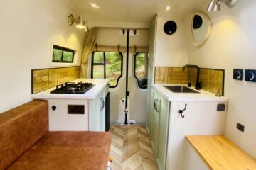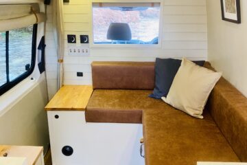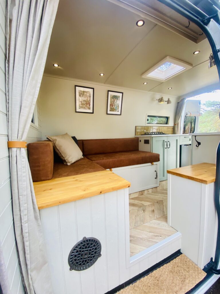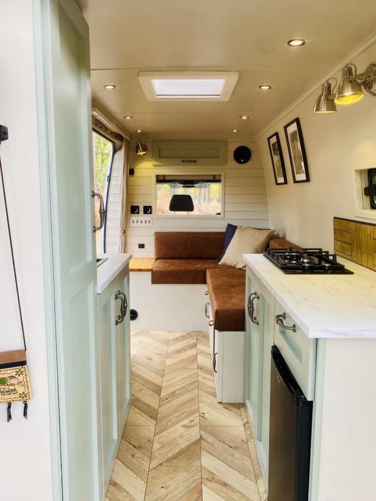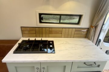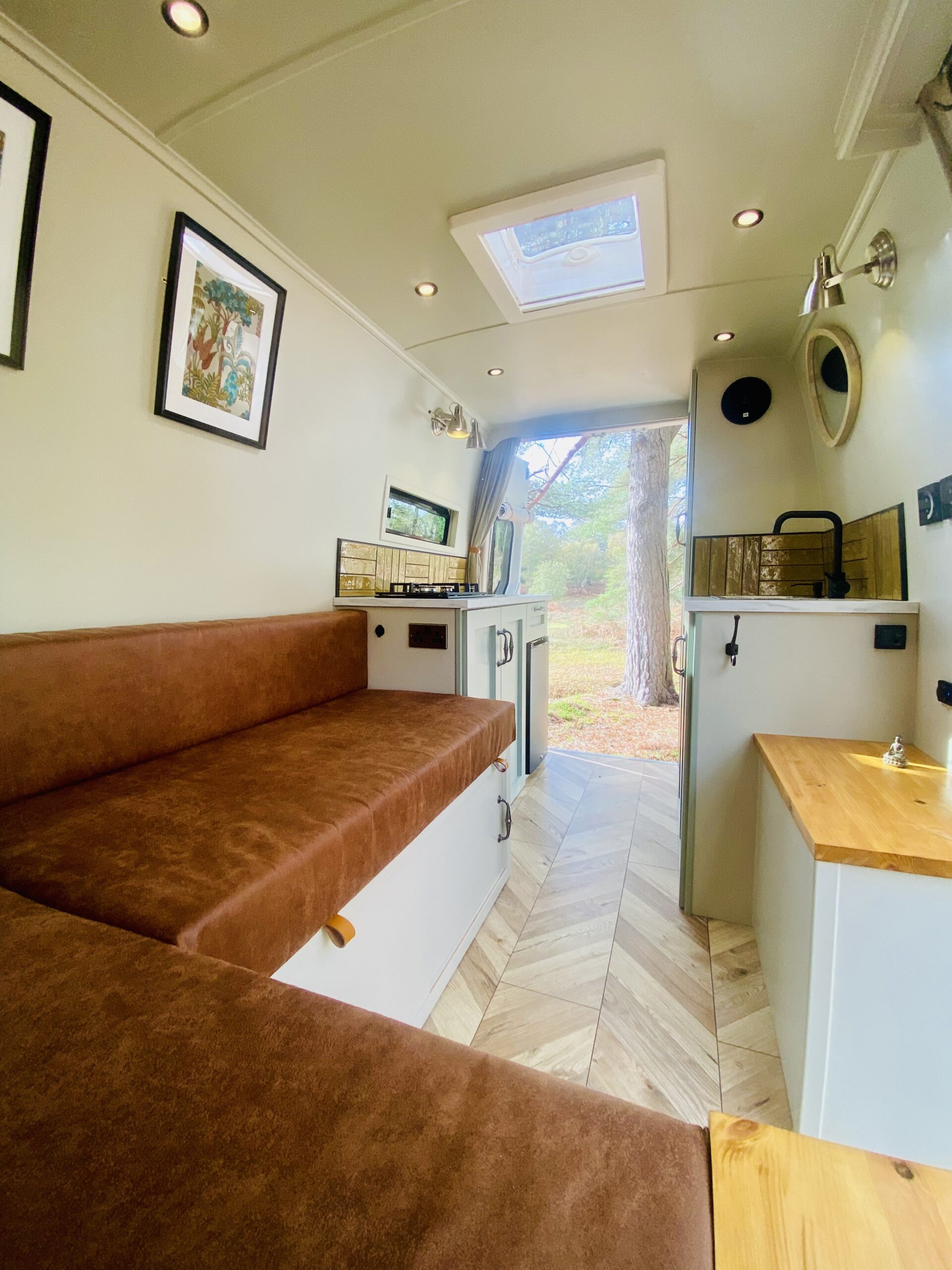 From our past experience we decided that functionality and comfort are two things we would not compromise on. Taking this into account we decided a corner sofa was the way to go. We fitted 4 windows in Jelsa and a Dometic roof vent to optimise the natural light. For us it maximised the views when sipping our morning coffee and it gives us an open space to socialise. The cushions are made from memory foam and upholstered with faux suede removable covers. Not only is the sofa an amazing space to relax it also doubles as a pull out double bed capable of sleeping 2 tall adults and the possibility of one more underneath. Plenty of storage for bedding and possessions can be found under the cushion pads, one accessed from a chest style lid and the other via sliding doors. Opposite the sofa you will find the water storage compartment capable of holding 50L of fresh water. Underneath the vehicle you will find a 60L waste tank which can be emptied by the drainage tap on the rear skirt of the van. Equipment such as the sureflow water pump, sureflow filter and accumulator are found in the bottom of the sink cupboard. Located at the end of the bed we have installed an efficient 8kw self contained diesel heater which is perfectly capable of warming the van on a cold winters night. Also we have installed a 12v JBL surround sound system controlled via Bluetooth allowing you to play your music so you can always vibe on the road!