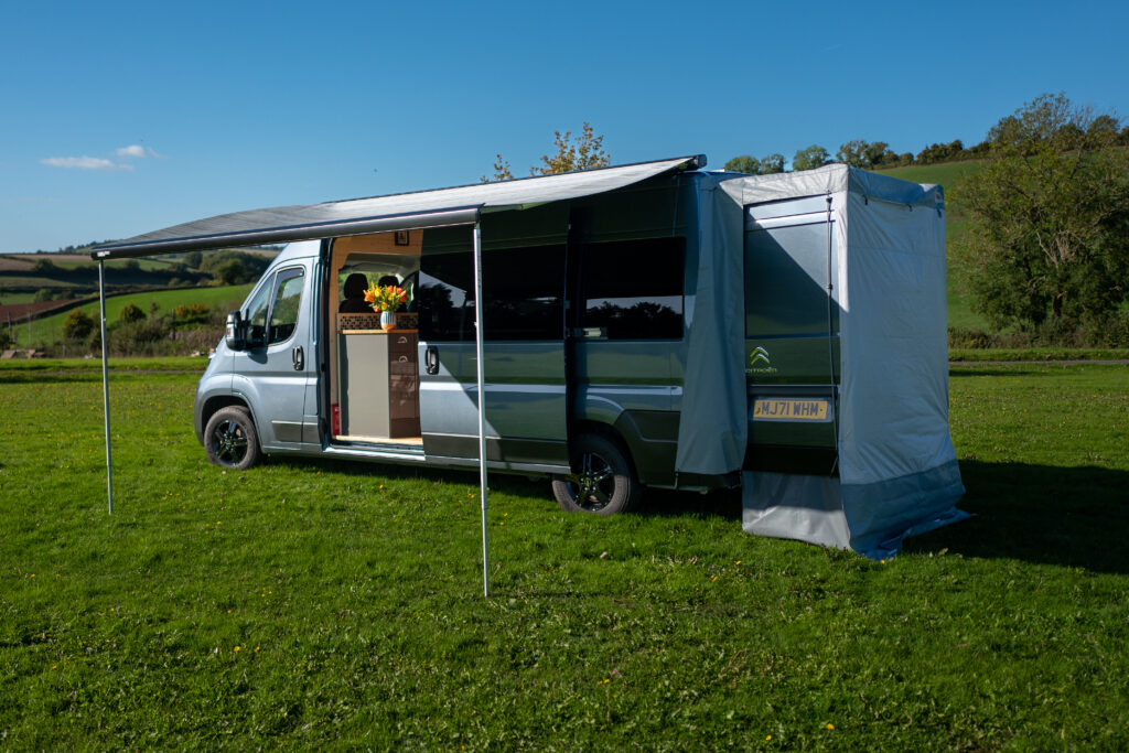 The Bobil Vans water heater can heat from 230v hook-up OR from the diesel heater if you are off grid. Meaning that you have constant access to hot water for the sink and rear door shower. The rear door awning provides an enclosed space of 2m2