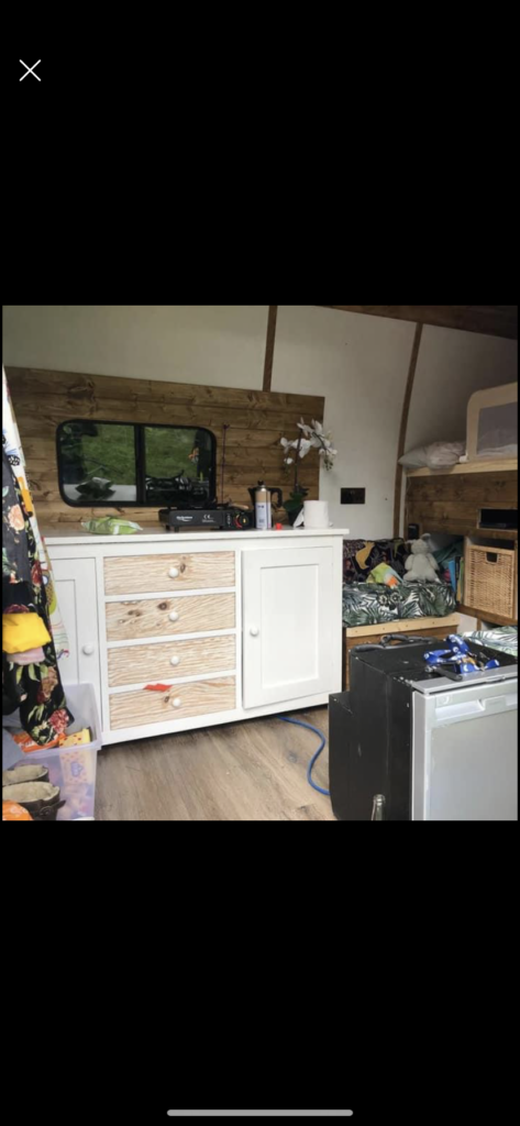 Fully insulated, part T&G clad, laminate flooring, fixed small double bed with memory foam mattress, 2 seats with storage and removable table with two table leg positions possible. 2 sliding open windows on sides, and a roof window