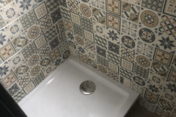 Fitted shower / with curtain in tiled shower room with opening window with under truck brown water container..