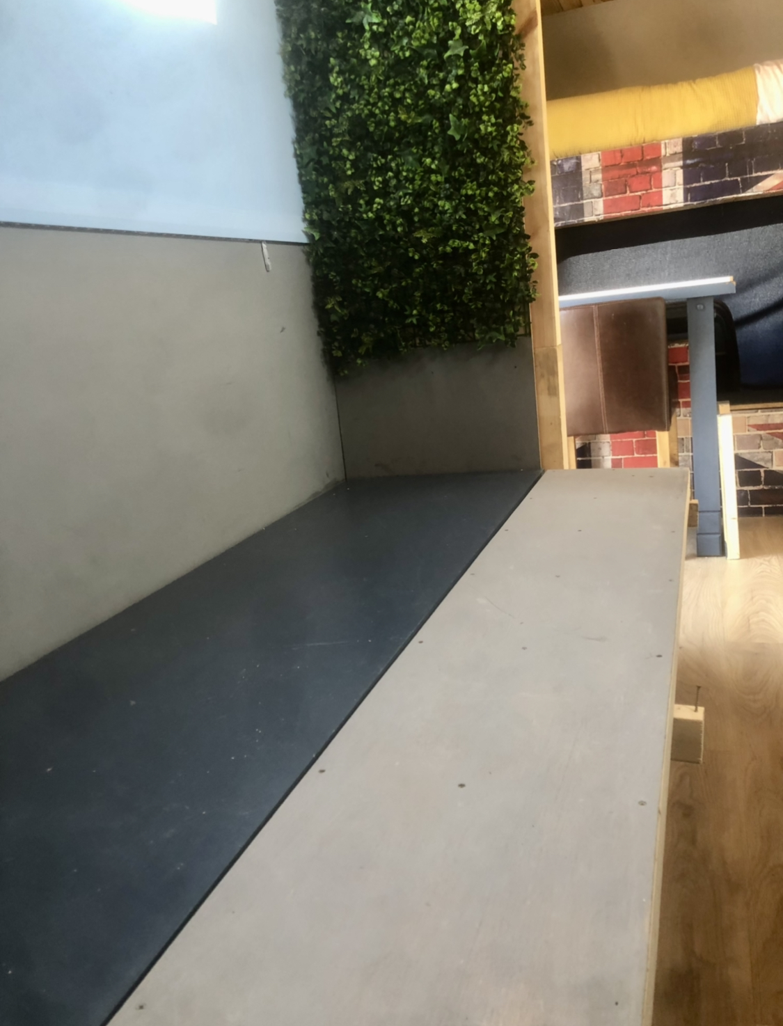 Carpentry built convertible sofa that flips in to a double bed with top seats ( from Mercedes’ sprinter conversation) main cleanable fabric with black leather detail.