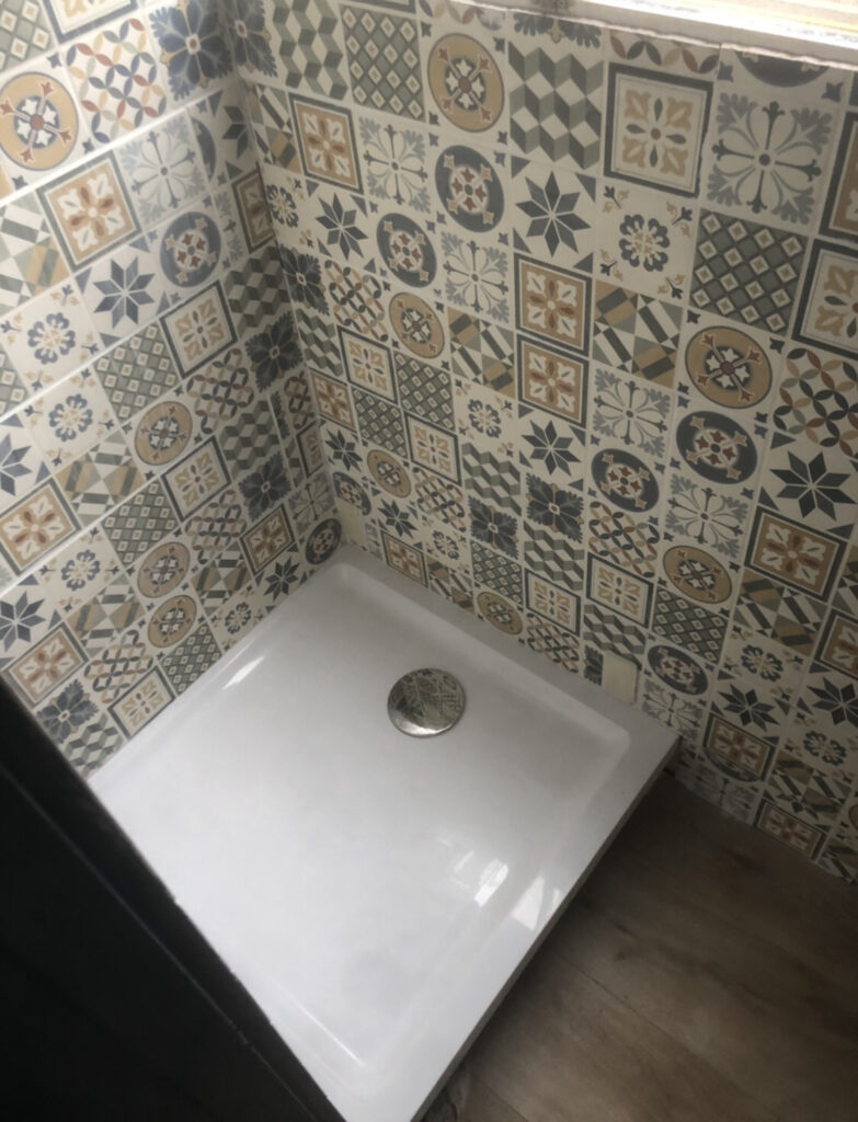 Fitted shower / with curtain in tiled shower room with opening window with under truck brown water container..