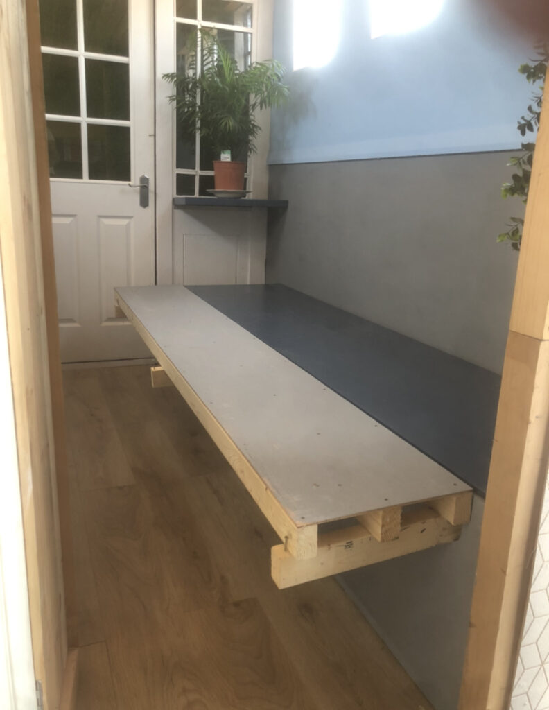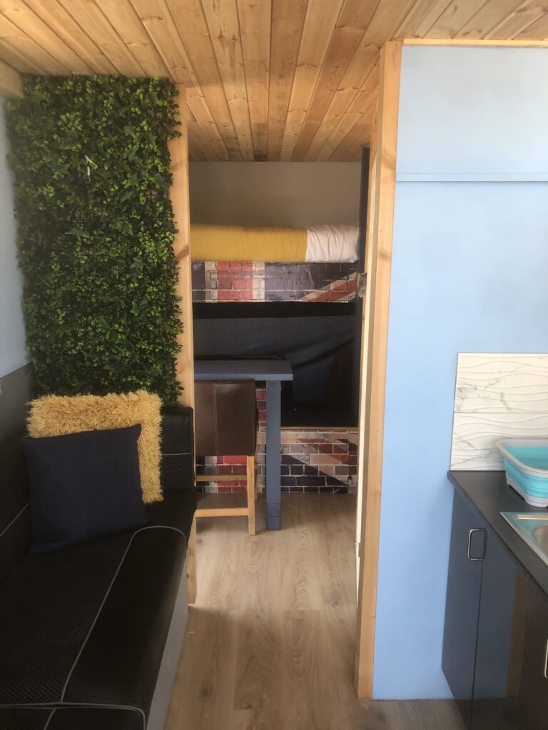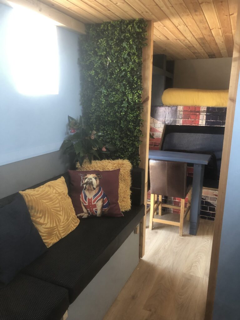 Carpentry built convertible sofa that flips in to a double bed with top seats ( from Mercedes’ sprinter conversation) main cleanable fabric with black leather detail.