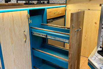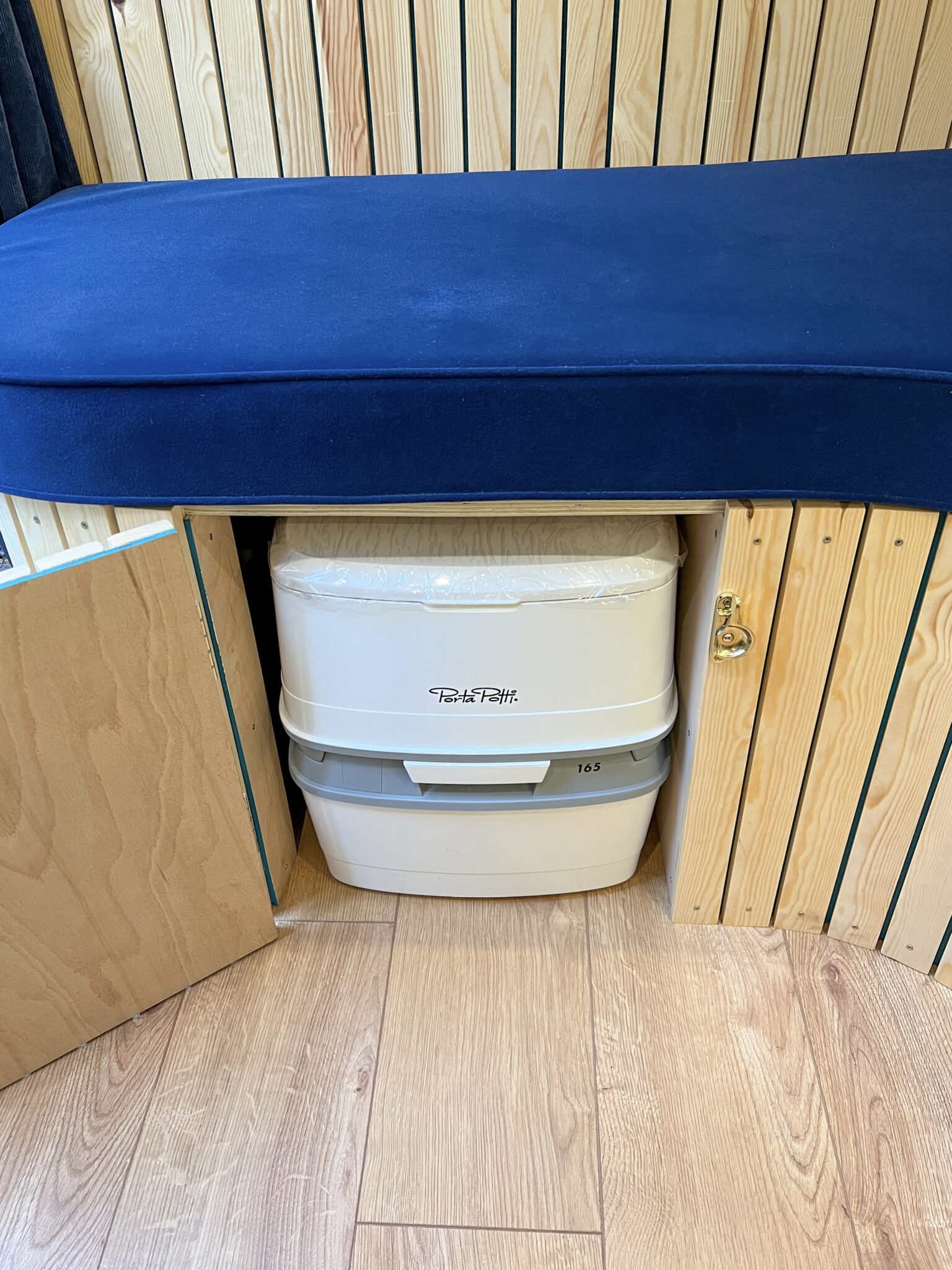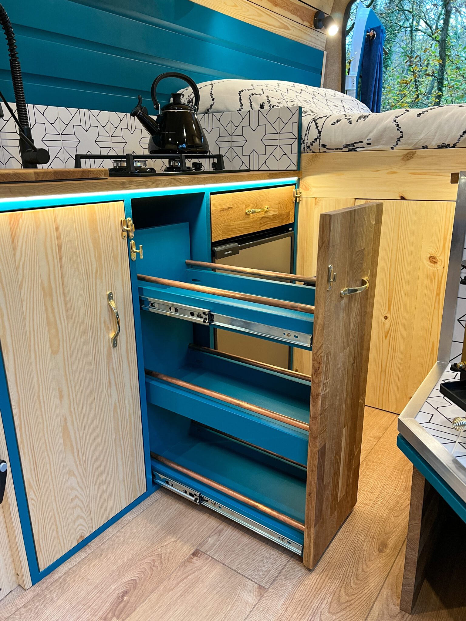 Tons of storage throughout including huge under bed ‘garage’ storage, overhead cabinets, overhead shelves, chest storage under seating and kitchen cupboards, drawers and pull out larder