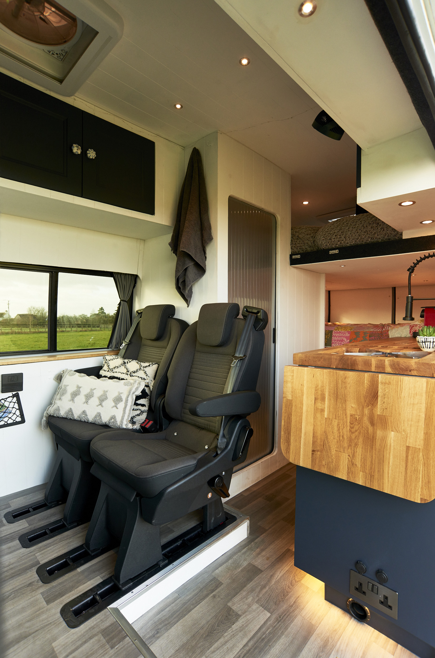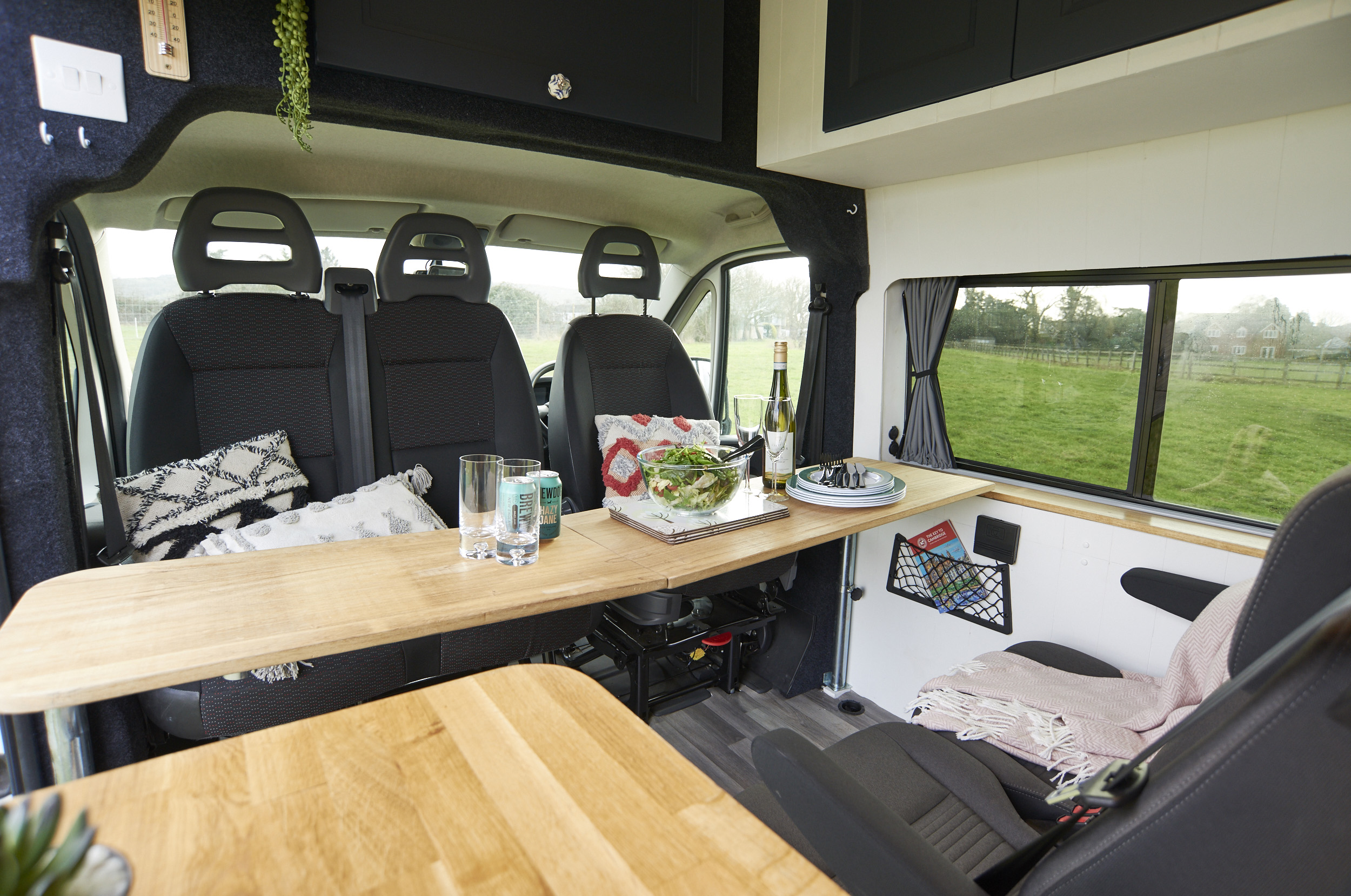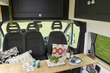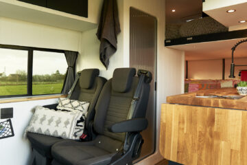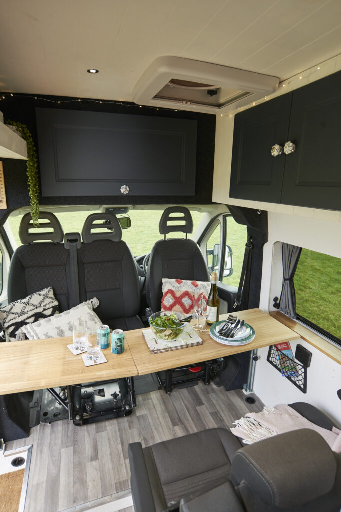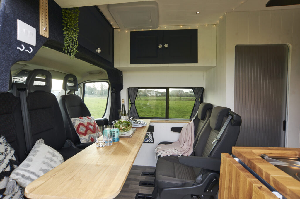 Seating: There are 5 forward facing belted seats. All seats are capable of fitting child car seats and have headrests and standard 3-point seatbelts. The rear two seats have Isofix points. Three seats in the front all spin to face the rear two seats with a full-width table to give a spacious seating and eating area. The table can also split allowing for flexibility. The rear seats can be removed individually if necessary to give more room.