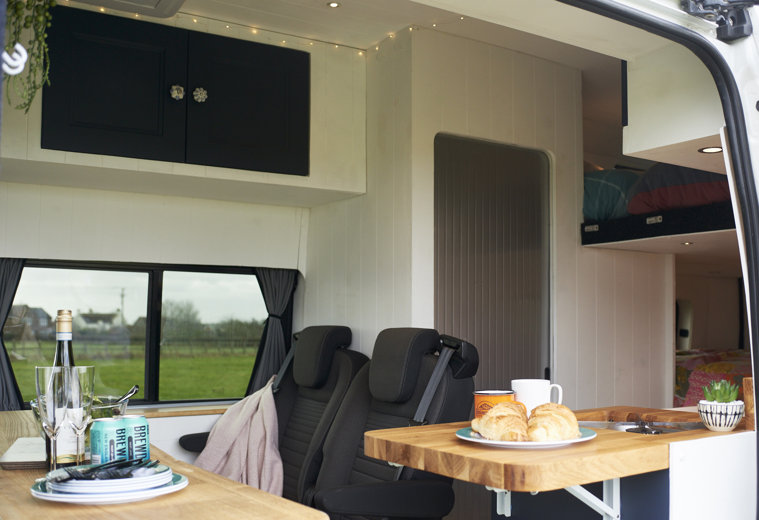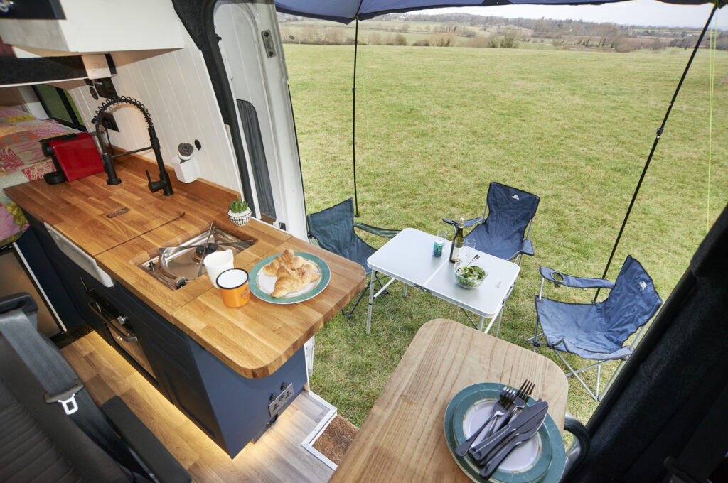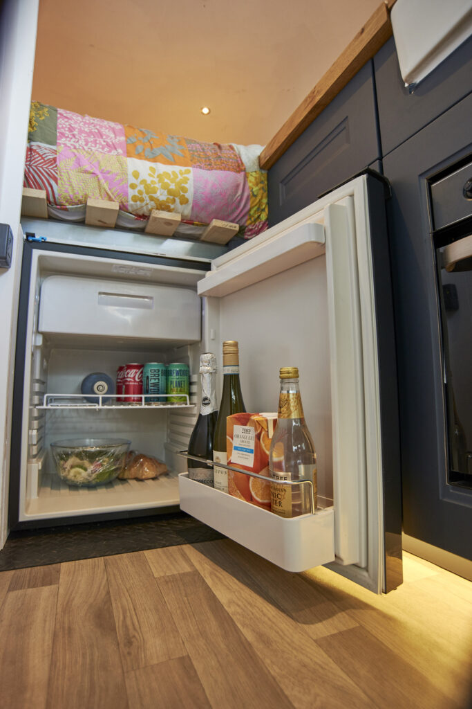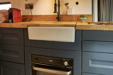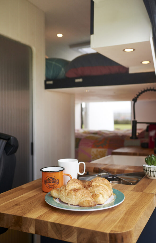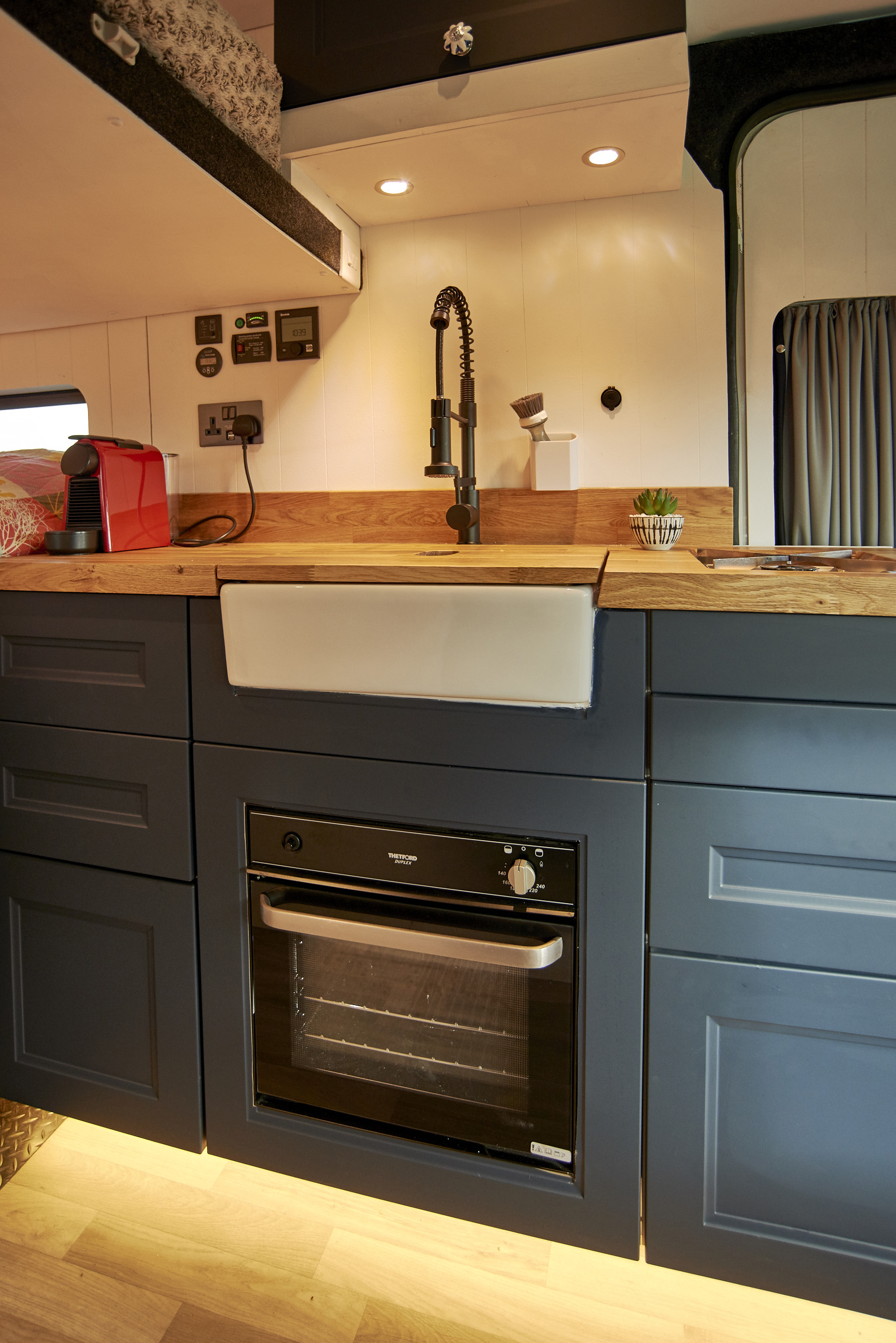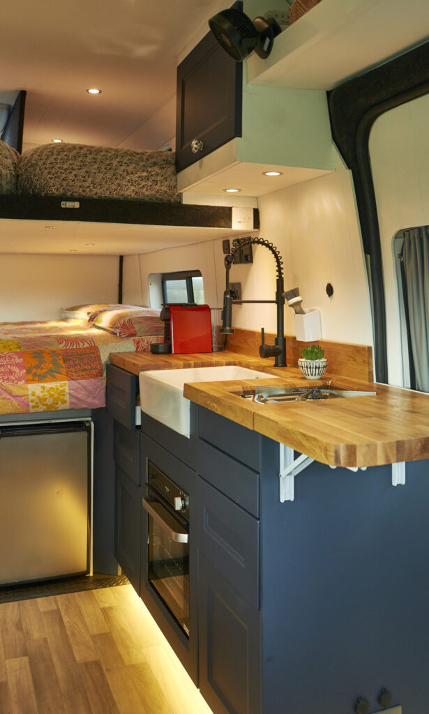 Kitchen Equipment: The van is equipped with a single very powerful gas hob and a gas cooker/grill. There is also a large 85-litre electric compressor fridge freezer to keep things chilled and frozen. The Nespresso coffee machine and milk frother will also come with the van. The Belfast sink is spacious to wash up all pots and pans and has a lid which can hide anything left to wash up later.
