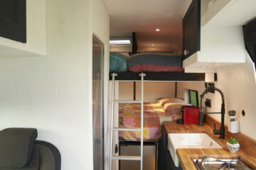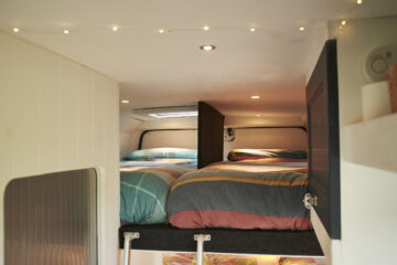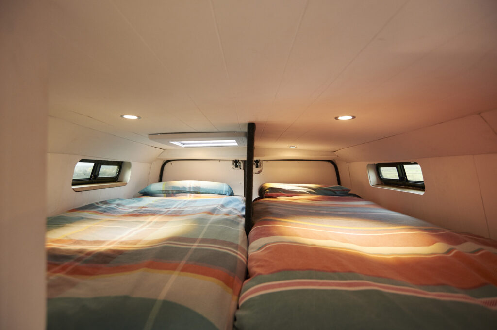 Beds: The beds sleep 4 people in fixed beds. The double bed is 185cm x 135cm and has a very comfy memory foam mattress. The two singles (which can easily be changed to a double) are 75cm x 190cm and also memory foam. All beds have windows next to them which can open to allow air in. All beds will fit adults (the lower bed may be a little snug for anyone over 5’11”). The beds were designed for a growing family of 4.