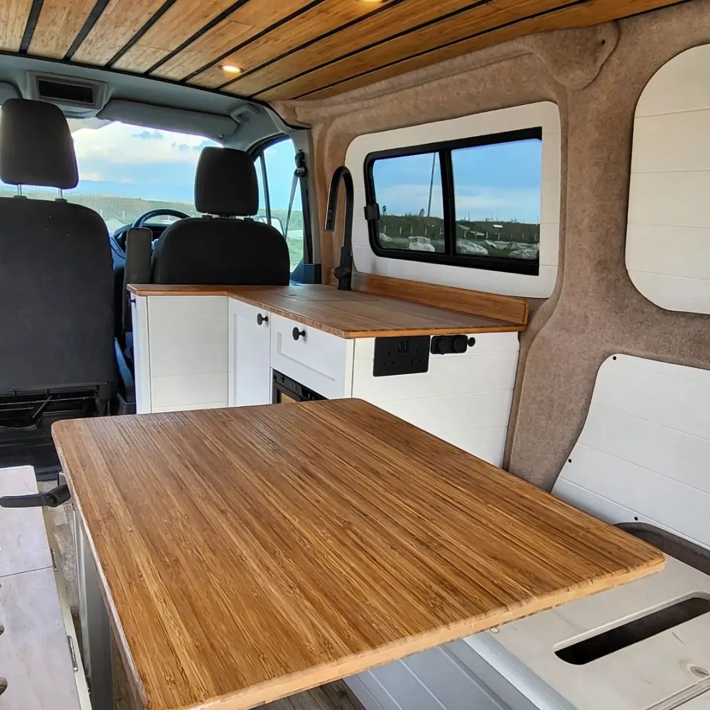 Professionally converted by M2M Conversions. A host of features tailored for comfort and convenience, including a Diesel Heater with a digital display, a modern kitchen setup boasts a 12V fridge (with small freezer), sink with tap (supported by a 10L water tank and 10L waste water tank), a pull-out pantry, and a bamboo work surfaces. We have always cooked with the CADAC 2 burner hob (not included but available new for less than 100), which works for indoor to outdoor use and fits perfectly under the seats.