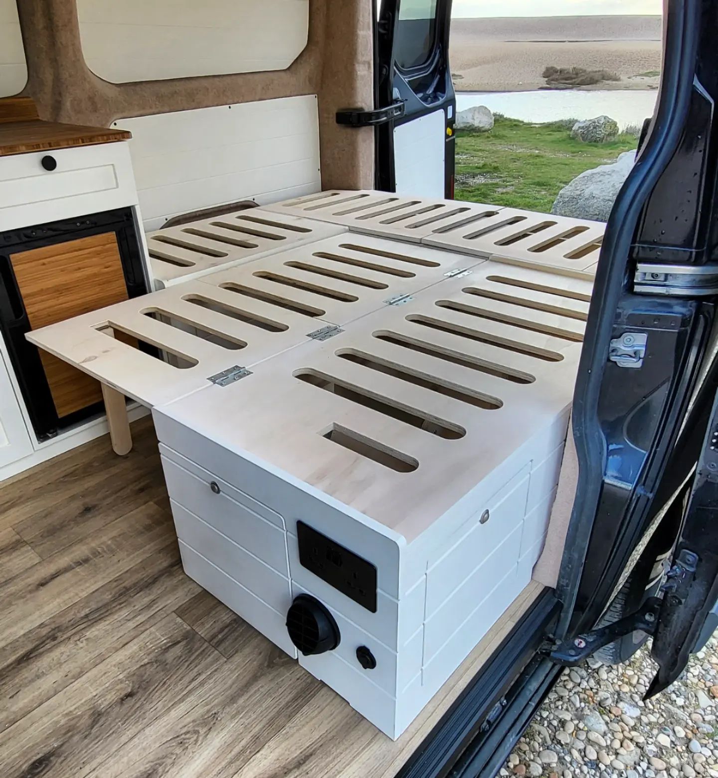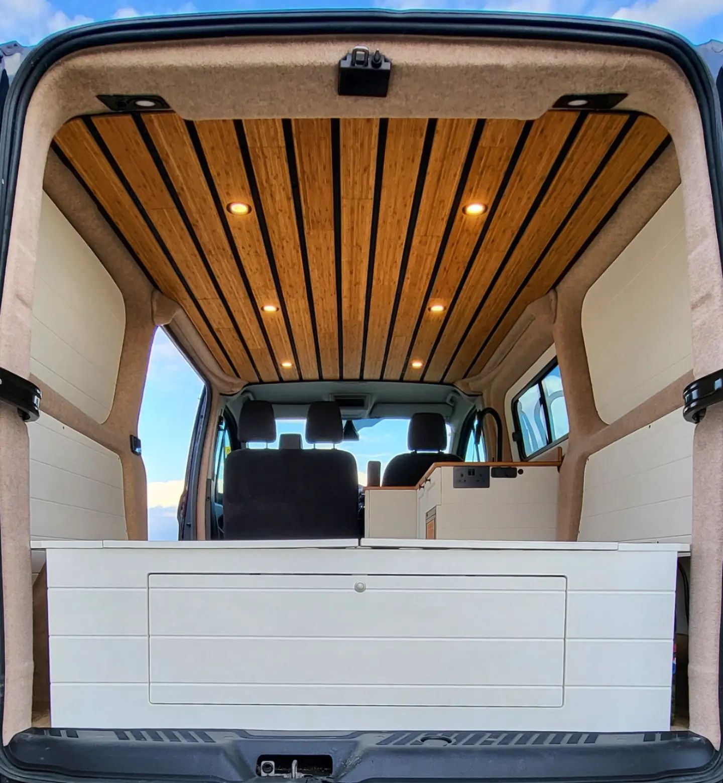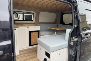 The camper is powered by a leisure battery with the option to plug into a 240V source when on site. There are multiple USB charging points and standard plugs in the van itself.