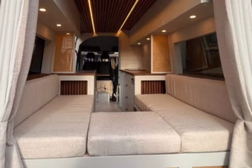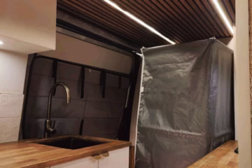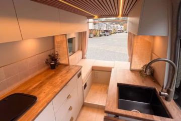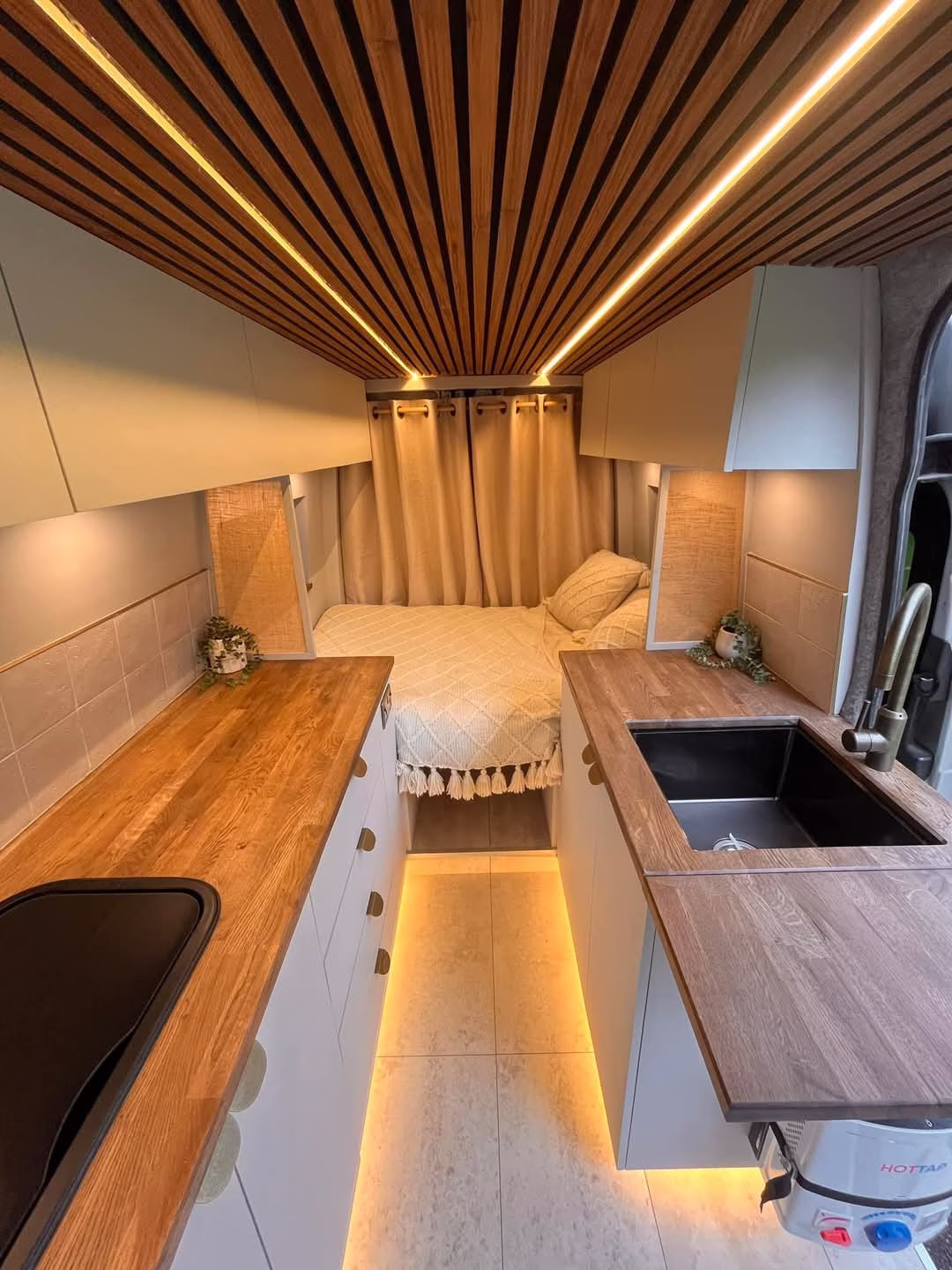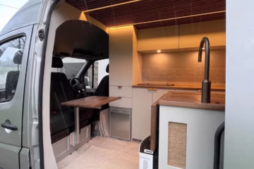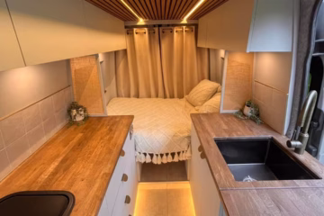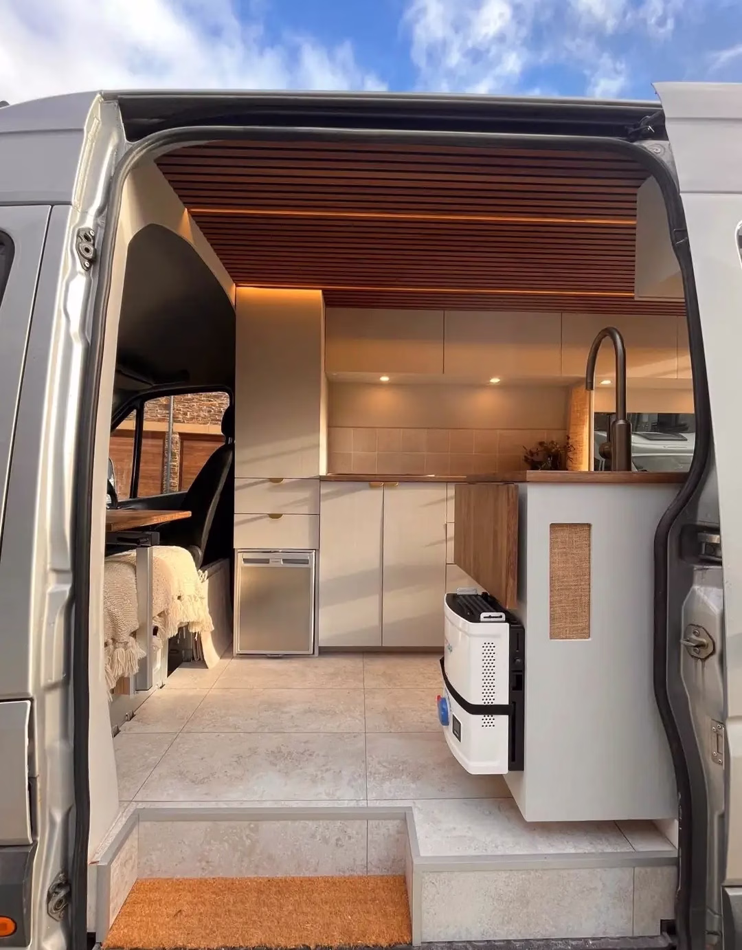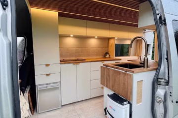 The van comes with a fully equipped kitchen that is both functional and stylish, finished in a warm grey palette with brushed brass hardware.