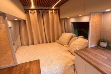 The seating area also houses the electrical system, portable toilet and has two XL storage spaces. There are quick attachment magnetic blinds matching the decor for all windows to have complete privacy at night, feels like a lodge on wheels! There’s even a built in diesel heater with remote to keep you cosy!