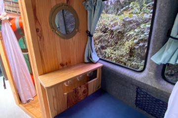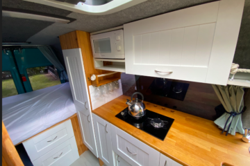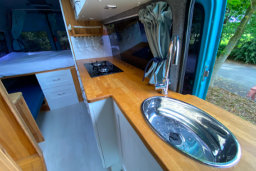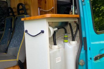 – The electric sink is connected to a 25L water tank which is accessed from opening the side door and sliding out a wooden panel. Can be filled via funnel or hosepipe with lock fitting to avoid spillage. The waste barrel, also 25L can be taken out with ease to empty.