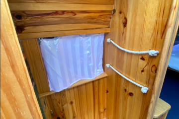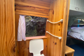 – The shower is beautifully crafted from solid wood with feature wall and hand made marine wood shower tray. There is a solar shower that is worked by hand pumping water and is fully portable. Can be filled with hot water too.