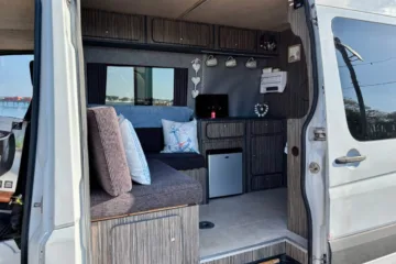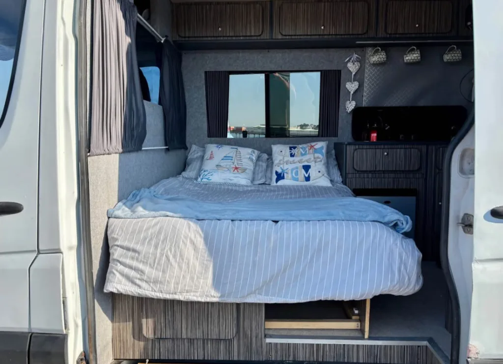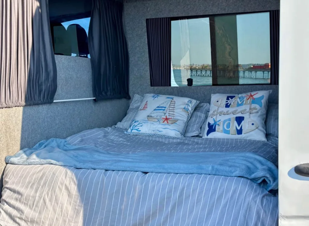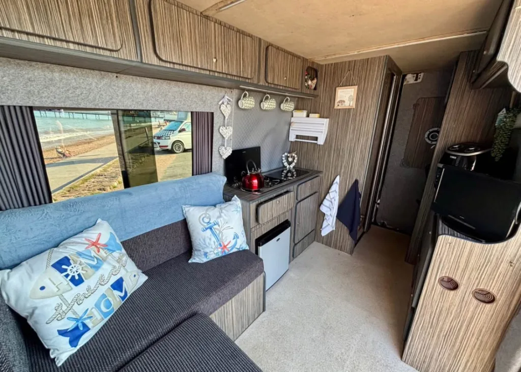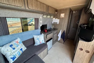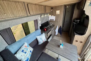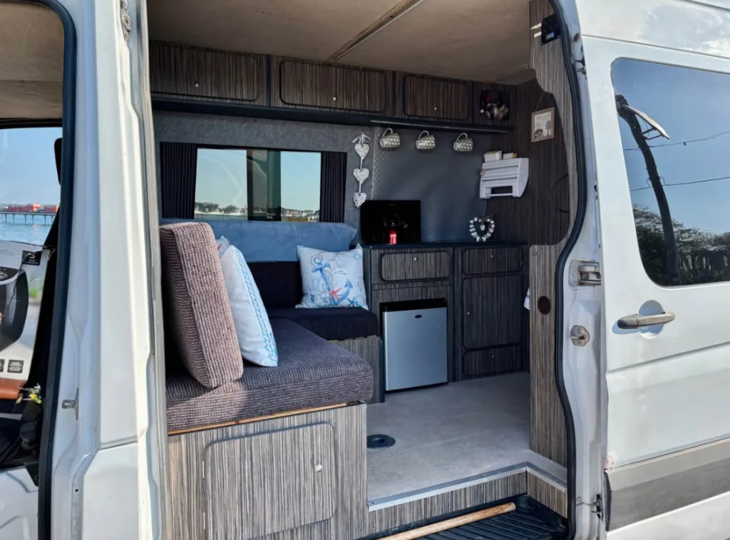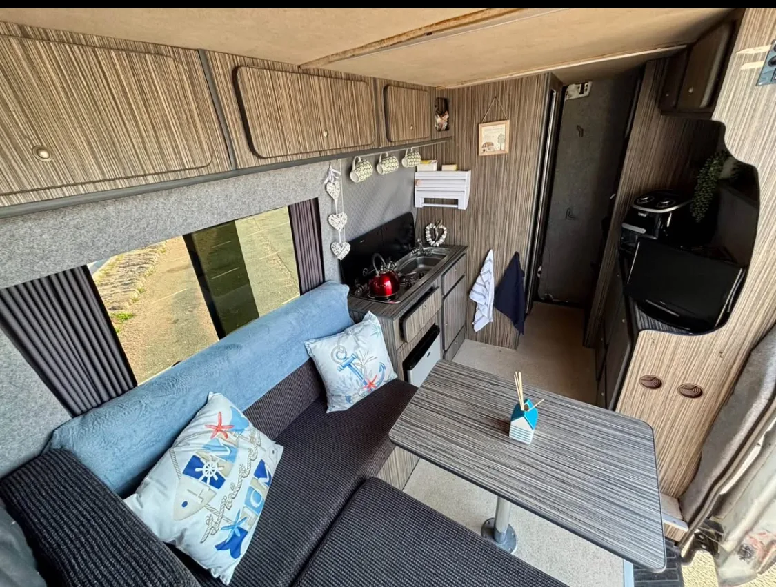Stunning conversion. Chain driven so mileage low for these vans. 12v electrics with leisure battery and 240 sockets. Tv, awning, cutlery plates, air fryer, toaster, microwave, kettle, all come with van. Fold out bed (partner 6.4 so plenty big enough) super comfy seating. Toilet, with sink (shower easy to hook up) no solar, as not needed. Black out curtains, access from side and back and can take the screen out as it’s not permanently fixed to access cab. Portable tables for inside and out. Light and airy as well insulated. Does everything you need it to. Sink and 2 gas hob burner , wardrobe, and loads of cupboard storage. Huge storage under bed and above cab. Drives superb and is great on fuel, pulls up hills in 5th and 6th. Reverse camera, and 3 belted seats in front cab. New tyres, gear cables, since we had it. We bought for temporary measure to work away in as crashed our last LWB but need bigger with all our dogs. This is a lovely van with no issues at all.