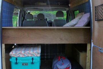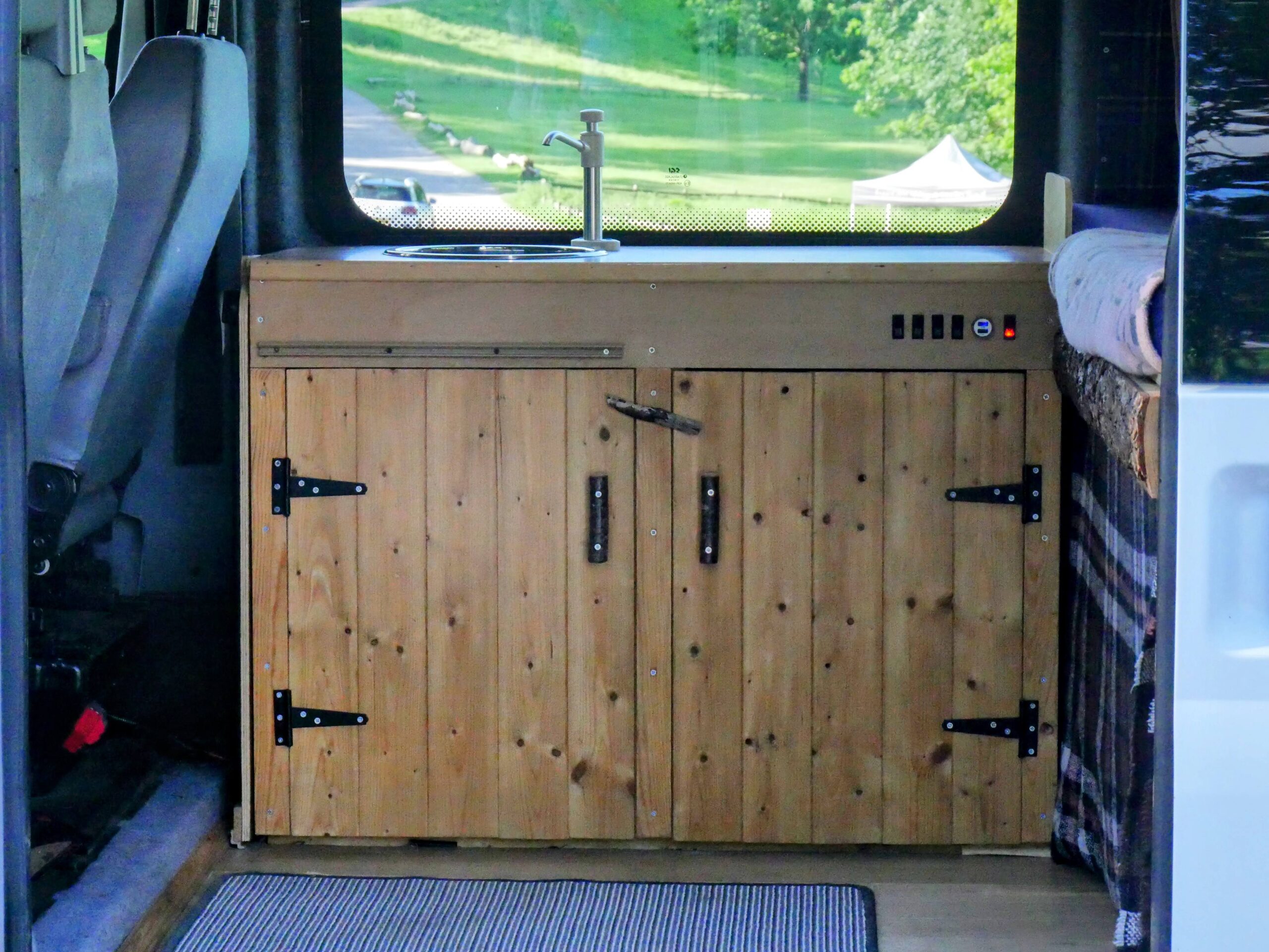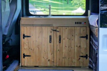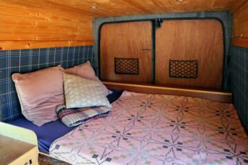 The conversion is basic but functional and tidy, with insulation and internal wooden cladding, a fixed small double bed, hand pump sink and cupboard storage, and leisure battery powering electric LED spotlights and USB charging port. The garage area under the bed is open, allowing maximum storage and makes a flexible load area. Prior to baby number 1’s arrival, we raised the bed by making 4″ extensions for each leg to allow our bikes to be stored upright underneath the bed, using fork mounts screwed into the floor.