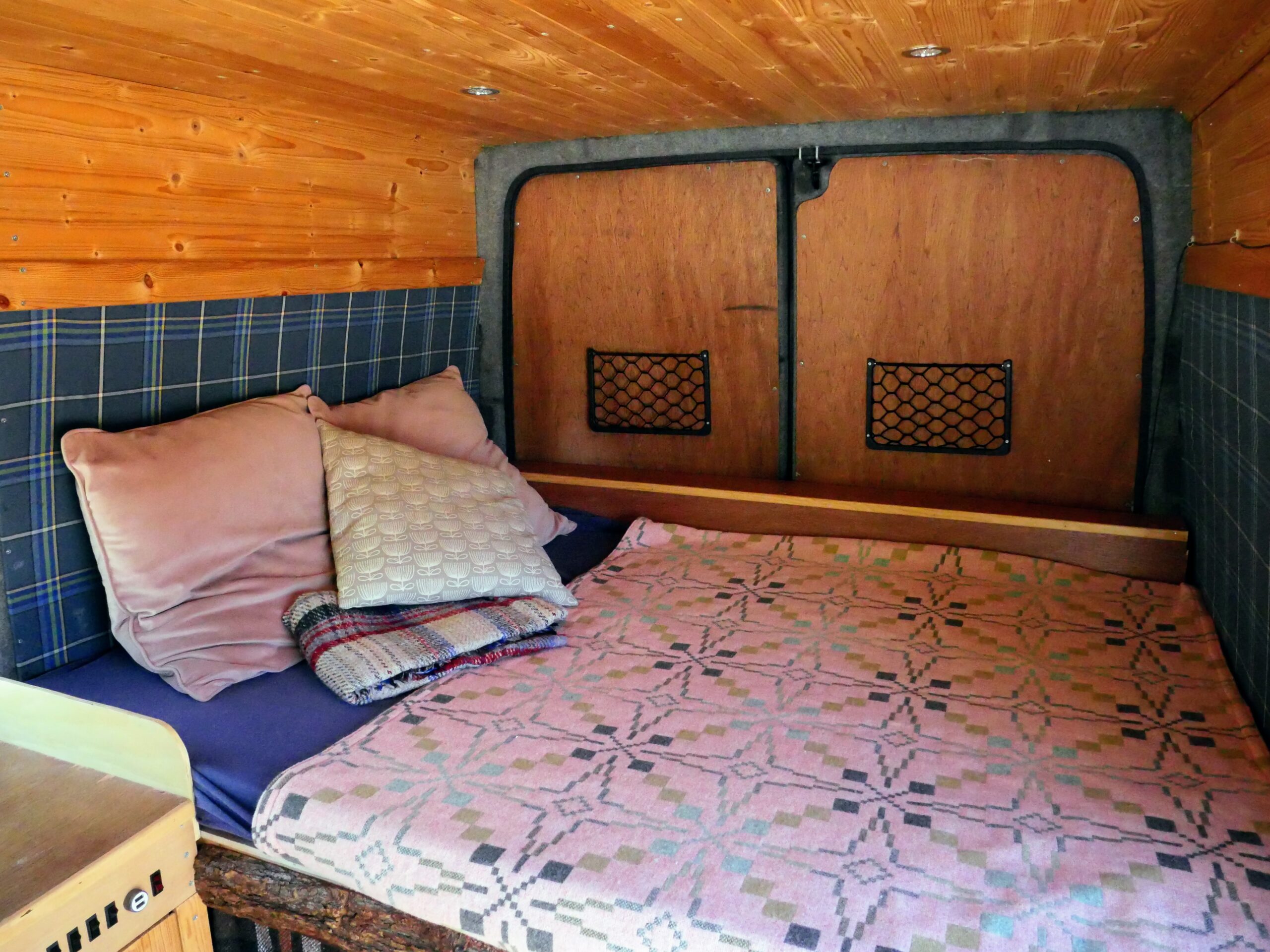 Small fixed double bed widthways across the van. I think it would be easy to add another bed if needed for a third person/child, either behind the front seats or under the existing bed.