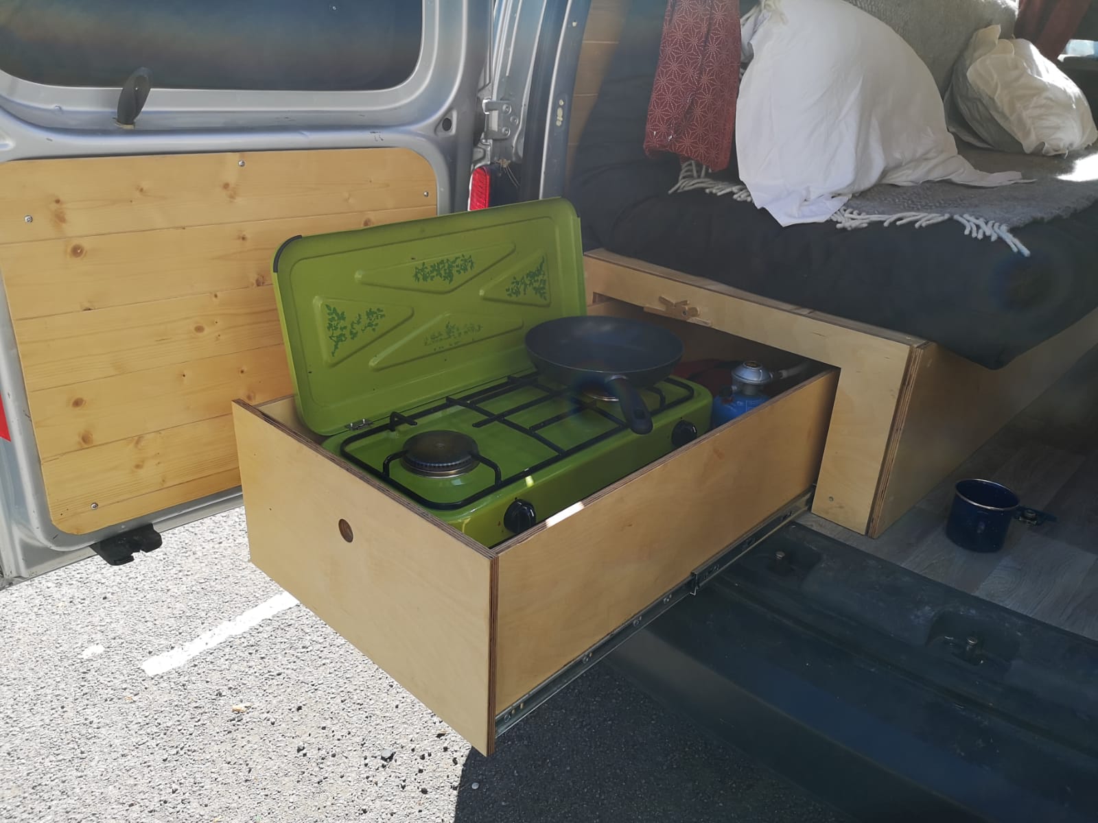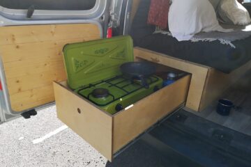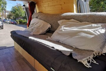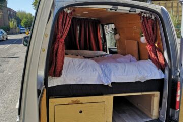 Originally a panel van that was converted around 2019 into a basic camper. It’s a long wheel base caddy maxi, with a sofa than pulls out into a full double bed, an extensive storage for cooking equipment, clothes and whatever you might need for adventures. When packed into a sofa, it can fit two bikes inside, but there is also a roof rack on the top. It has a foot pump and water storage. The camper was installed with a leisure battery, but this went dead and hasn’t yet been replaced. Despite its small size, it’s been on a two week trip to France, a week trip to Scotland, and endless weekend trips in the UK.