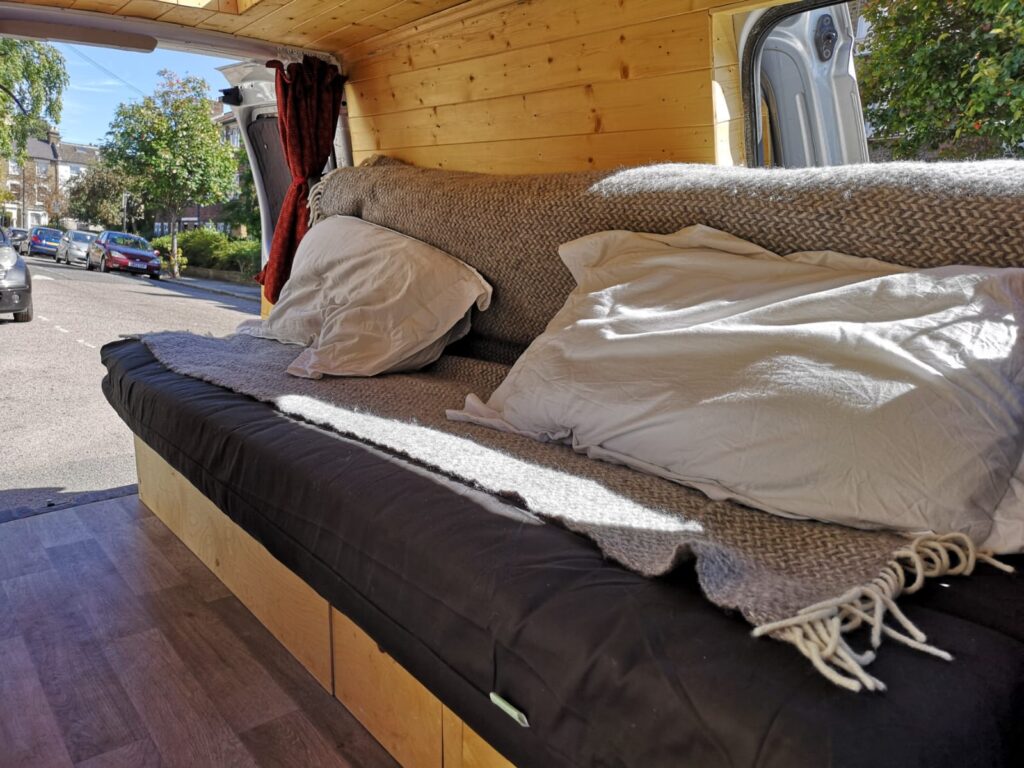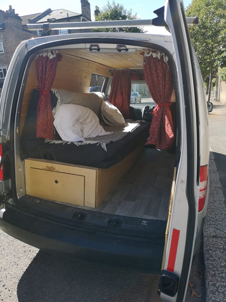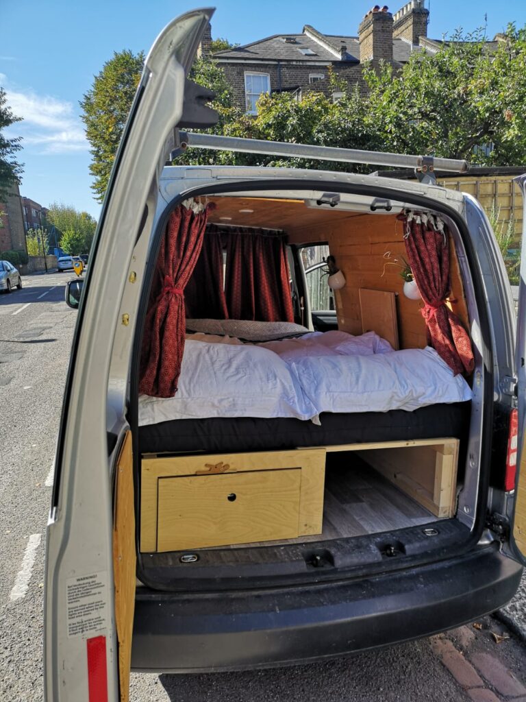 Originally a panel van that was converted around 2019 into a basic camper. It’s a long wheel base caddy maxi, with a sofa than pulls out into a full double bed, an extensive storage for cooking equipment, clothes and whatever you might need for adventures. When packed into a sofa, it can fit two bikes inside, but there is also a roof rack on the top. It has a foot pump and water storage. The camper was installed with a leisure battery, but this went dead and hasn’t yet been replaced. Despite its small size, it’s been on a two week trip to France, a week trip to Scotland, and endless weekend trips in the UK.